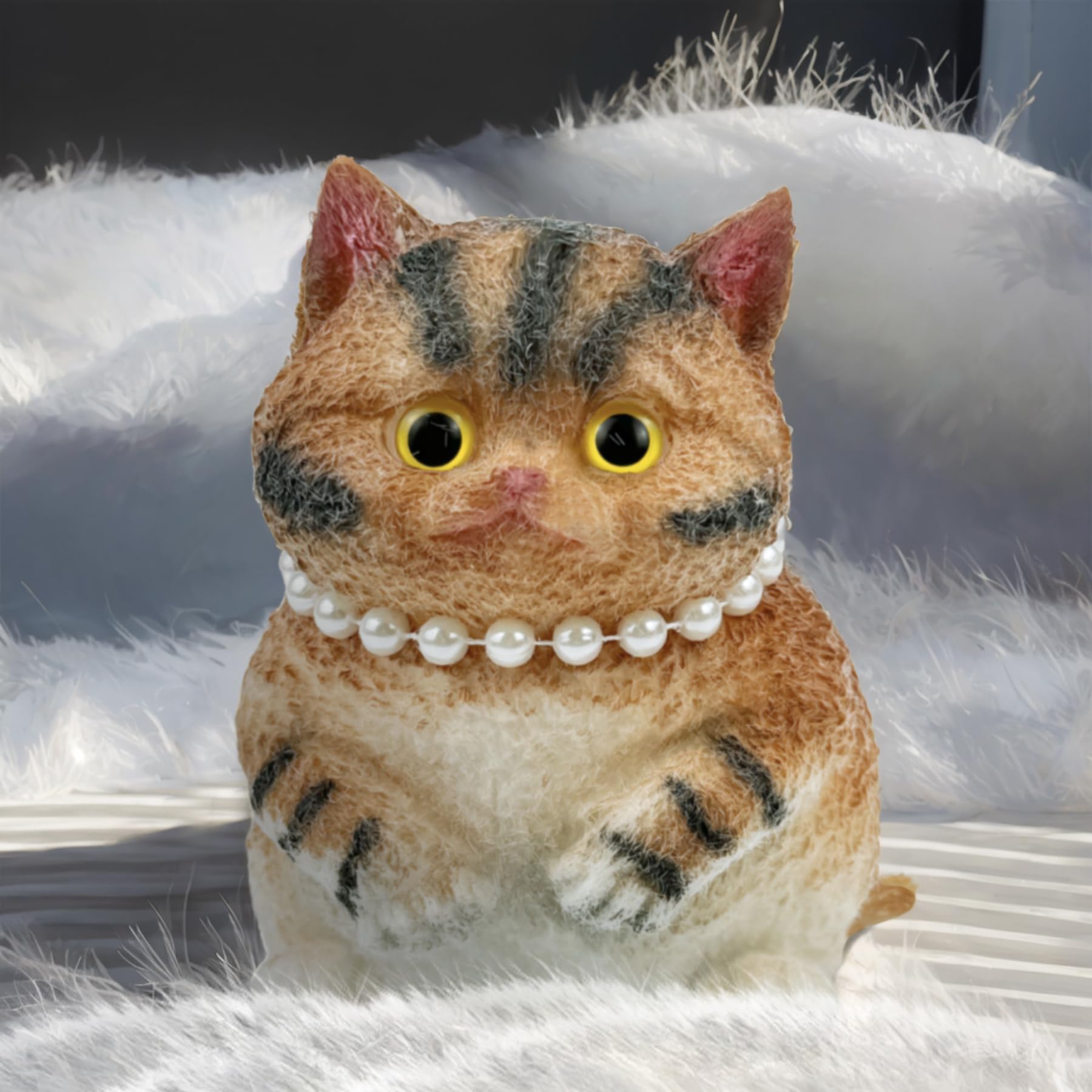 Warm Tips: Our taba stress cat toys are not edible despite their appearance. For the best experience, we recommend that you kneading use the supplied OPP ziplock bag to prevent surface flocking from sticking to hands. Please note: The surface plush is for decorative purposes only. If you want to play with the taba soft cat toy with bare hands, either rinse off the flocking with water and apply talcum powder, or wear disposable gloves before handling to keep hands clean. | Creative Stress Relief Design: This taba squeeze cat (4.53*3.94*5.7 inches, 1.66 lbs) stares up at you with irresistibly cute eyes, dressed in a delicate white pearl necklace! As a big taba stress toy, its jumbo size (larger than standard cat stress toys) and slow-rising malleable texture deliver deeper pressure for ultimate stress relief toys. Perfect for ADHD focus or office breaks, it