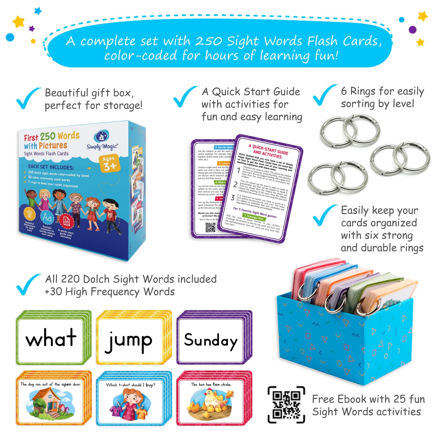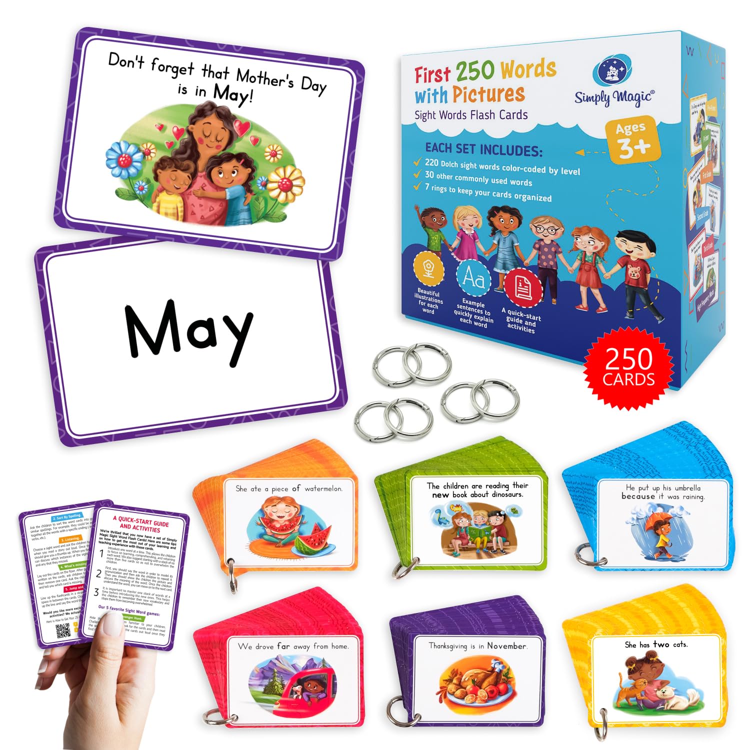 250 Sight Words Flash Cards For Kindergarten With Pictures, Dolch Sight Words Pre-K For Toddlers 3 4 5 6 7 8 Years, High Frequency Words Reading Cards For Kids Ages 4-8, Preschool - Simply Magic