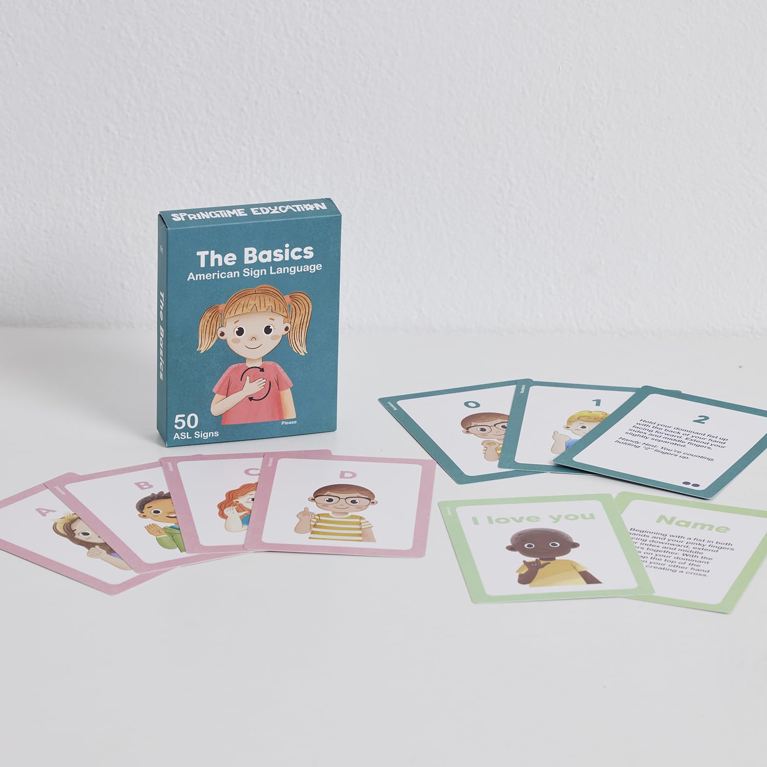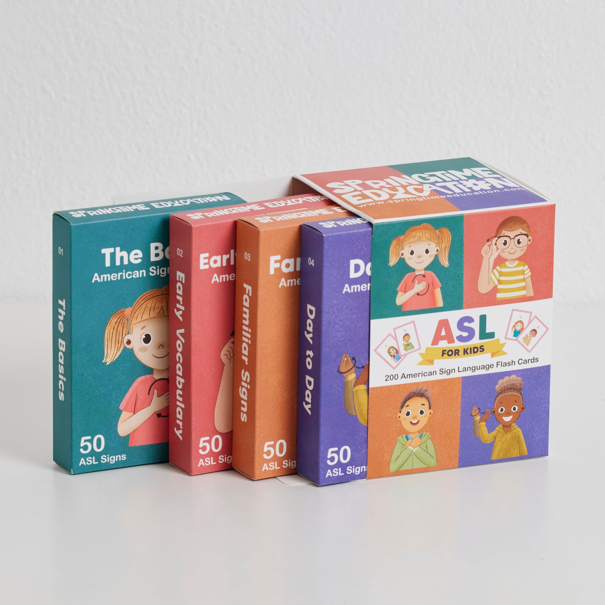 - Q: How many cards are included in the ASL Flash Cards set? A: The set includes a total of 200 American Sign Language flash cards, organized into 4 packs of 50 cards each, covering various categories such as The Basics, Early Vocabulary, Familiar Signs, and Day to Day.