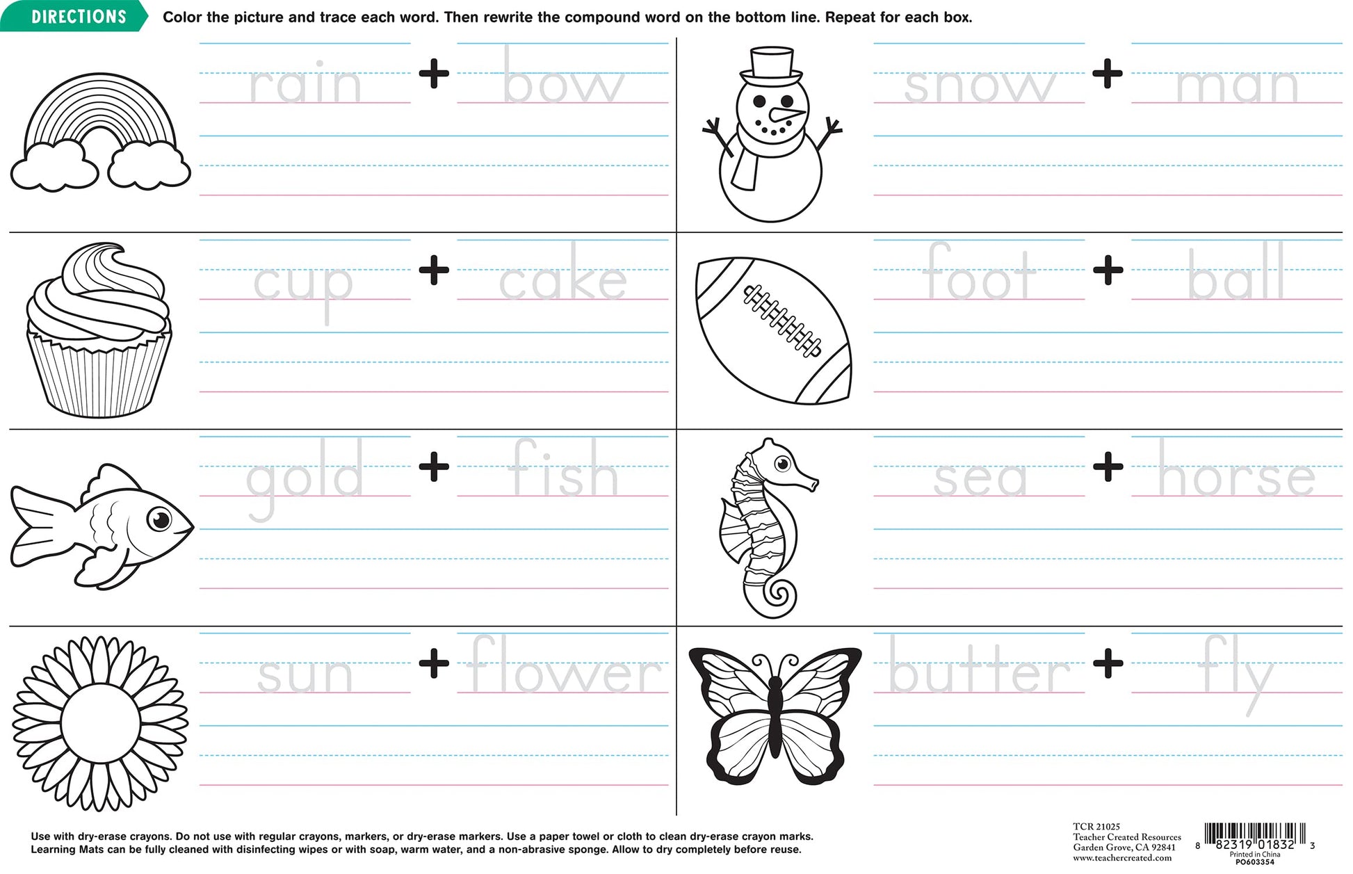 - Q: How do I clean the Compound Words Learning Mat? A: To clean the learning mat, use a paper towel or cloth to wipe off dry-erase crayon marks. For a deeper clean, you can use disinfecting wipes or a mixture of soap and warm water with a non-abrasive sponge. Make sure to allow the mat to dry completely before reusing it.