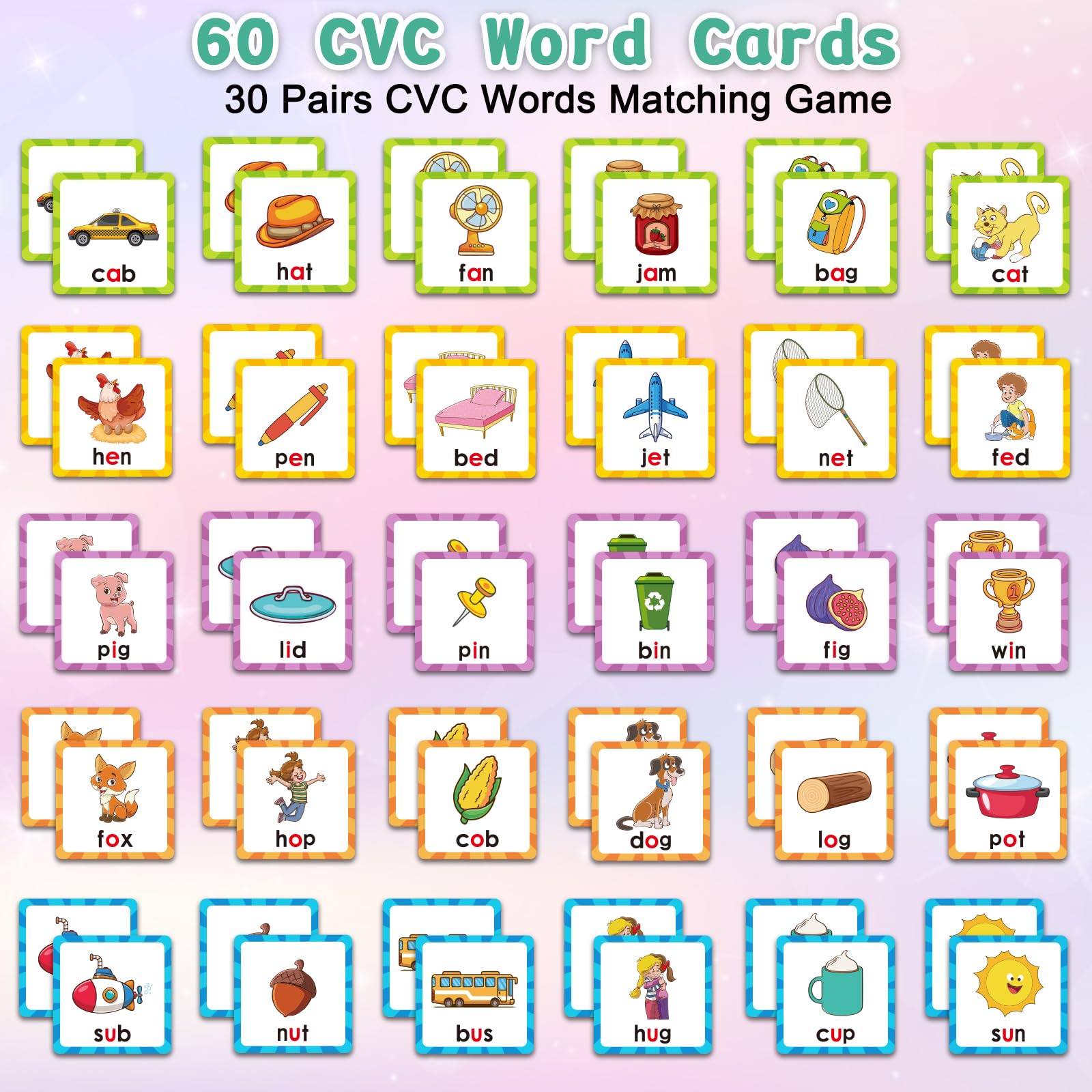 • Q: How does the Memory Game help improve children's memory skills? A: The Memory Game involves flipping and matching cards, which enhances focus and memory retention. Children learn to recognize and recall 30 CVC words while enjoying vibrant colors that stimulate visual perception, making it an effective tool for developing cognitive skills.