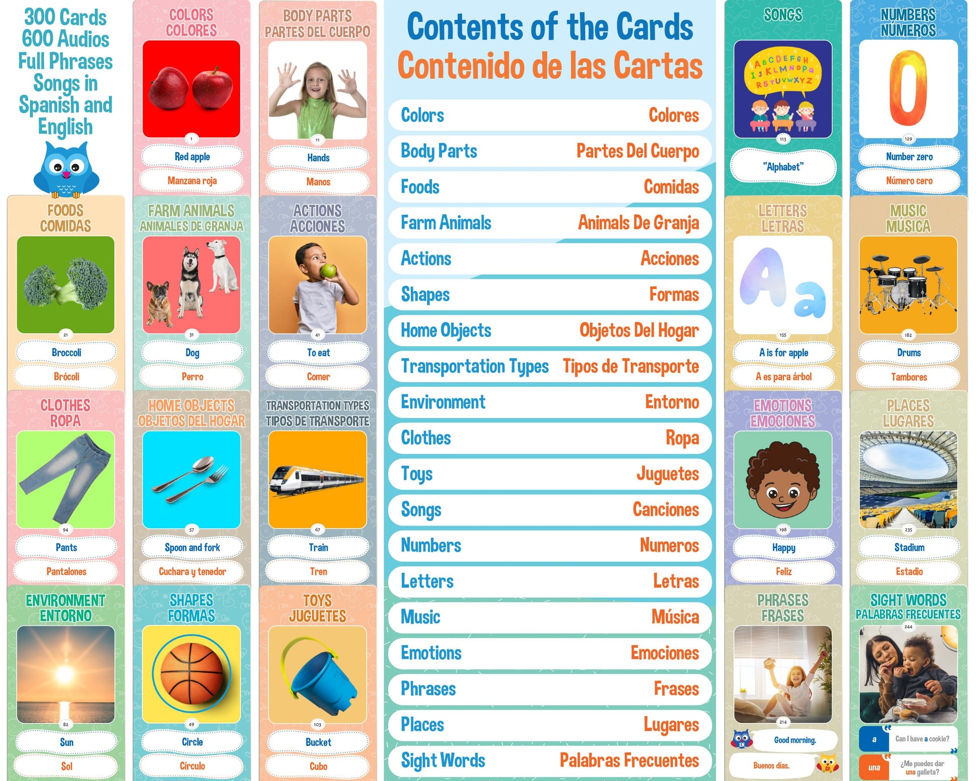 - Q: How do the interactive features of the flash cards work? A: Each flash card comes to life with the included card reader, which offers 600 audio pronunciations. This interactive feature helps children learn sounds and words in both English and Spanish.