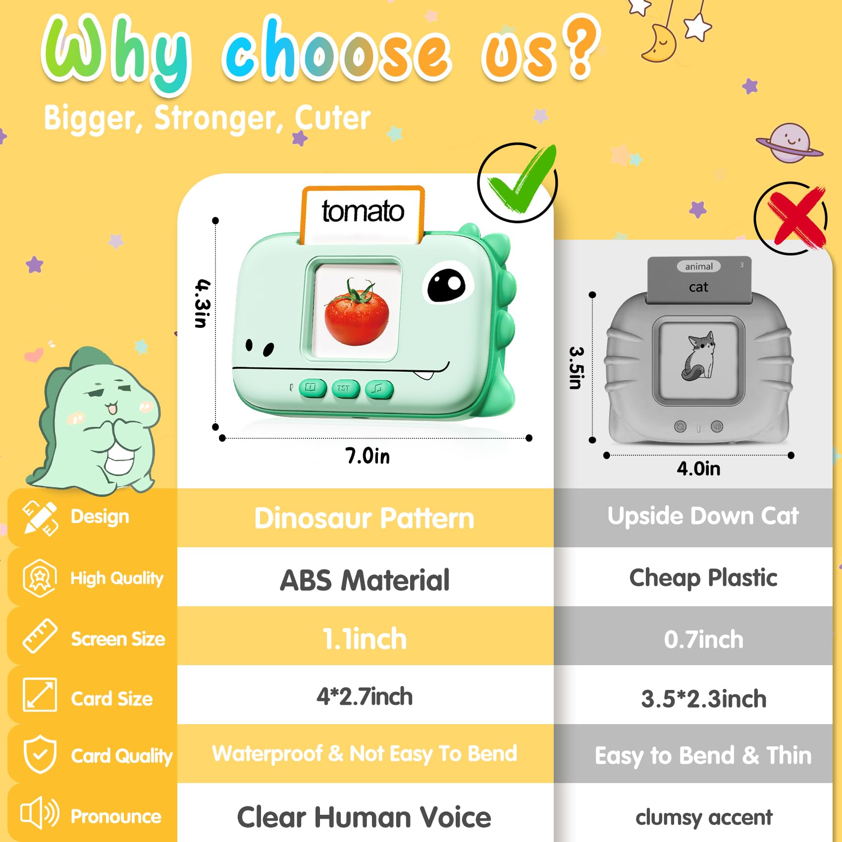 - Q: How does the dinosaur-shaped card reader work? A: The dinosaur-shaped card reader works by inserting a card into the card slot. Once inserted, the reader pronounces the word with a standard American accent and, for certain themes like animals and vehicles, produces corresponding sound effects.
