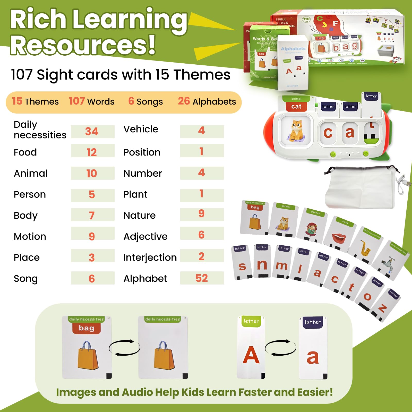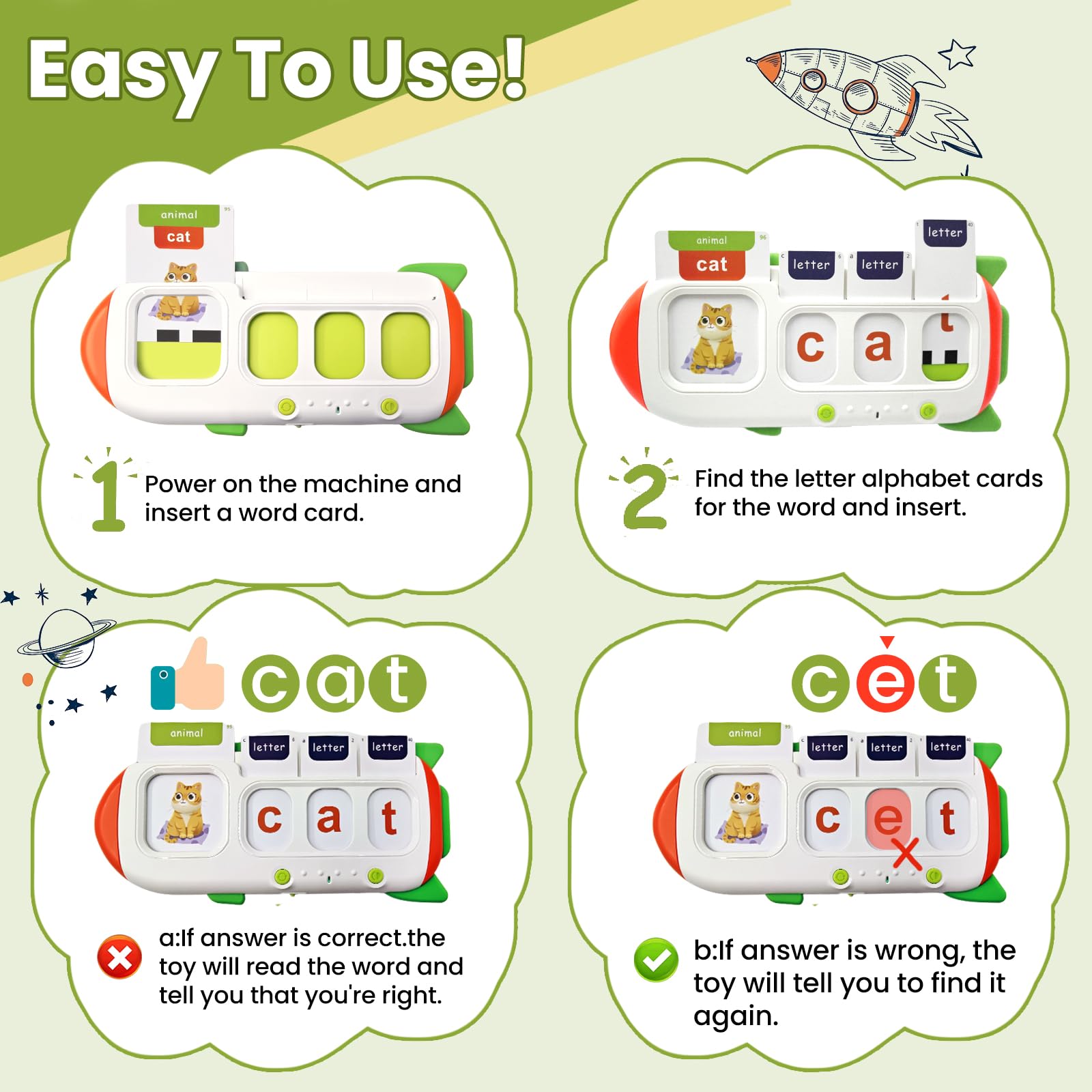 - Q: How do the CVC word spelling games work with the flash cards? A: Each card features a word and a picture on one side for letter matching games, while the other side displays only the picture for practicing spelling, helping children learn through interactive play.