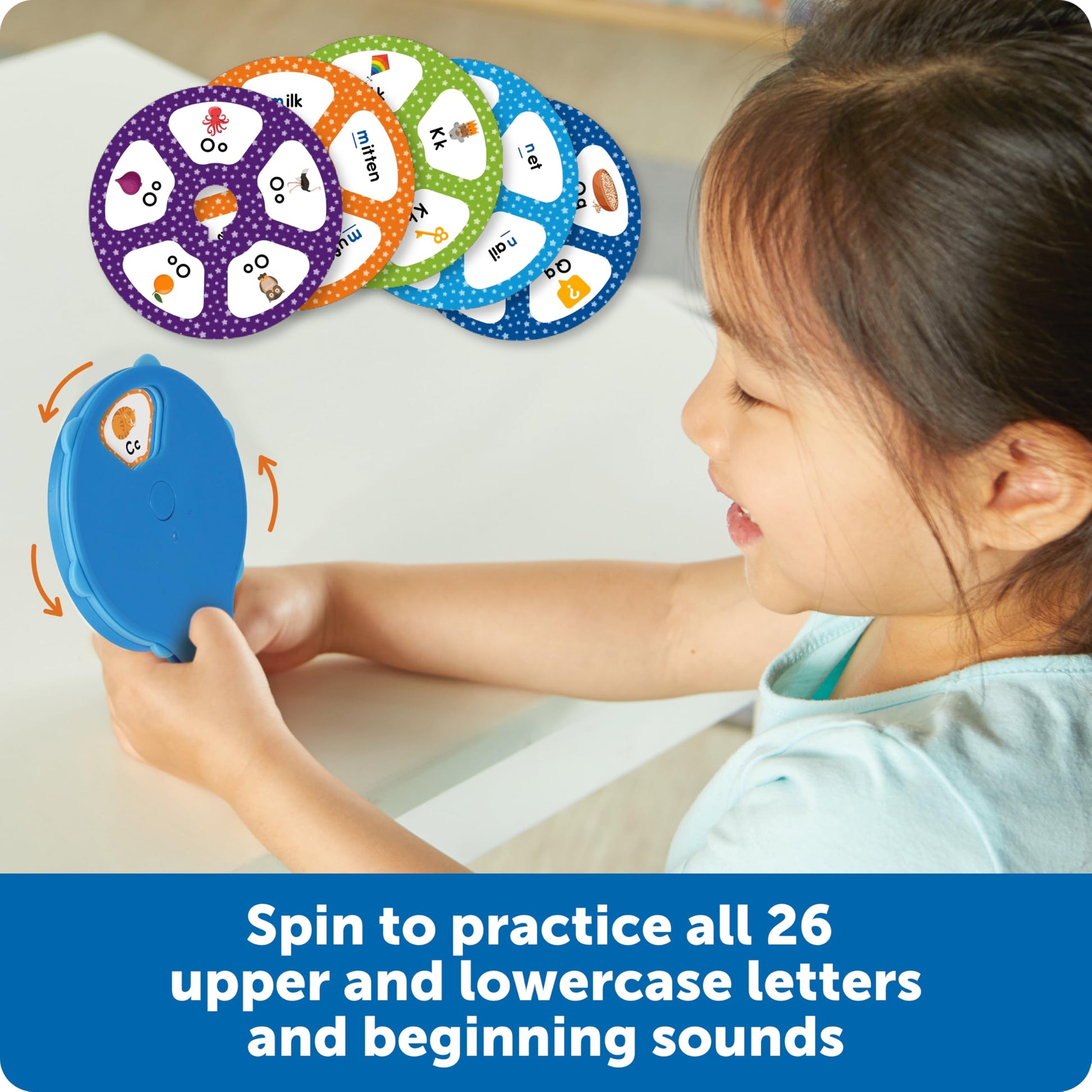 Looking for an easy way to help kids learn to read? Take the alphabet for a spin with this handheld learning wheel! Just pop in an alphabet flash card, spin to a letter and picture, then flip to check the best answer. Discover 26 cards-there's one for every letter of the alphabet! You can even turn the learning into a fun reading game, phonics game, and more! How does this quiz wheel help kids learn? The alphabet flash cards store on the back of the wheel for easy cleanup and on-the-go learning. Made from durable plastic, the Skill Builders! Letter Quiz Wheel is ready for years of learning, and makes an easy addition to sight word games or travel toys for kids. We're Learning Resources, and learning is where we play. Whether we're helping toddlers learn their ABCs and 123s, teaching kindergarteners the foundations of fine motor and social-emotional skills, or introducing elementary-ready STEM and coding skills, our award-winning educational toys help kids discover fun, easy ways to learn, play, and grow. That's why parents, teachers, and occupational therapists trust us. Check out all of our best-loved toys at our brand store! What are the main skills that kids can learn with this toy? The Skill Builders! Letter Quiz Wheel helps kids develop early language and letter skills. How big is this toy? The quiz wheel measures 5.25L'' x 4.25''W x 1.25''H How many pieces are included with this toy? This set includes 28 pieces. What is this toy made from? Our toys are made from durable, wipe-clean plastic thats designed for years of learning fun. This toy is compliant with EPA lead regulations. Where can I get a replacement part? While we're unable to stock replacements for every component that comes with our toys, we'll do our best to find the part or piece that makes your toy whole again. Just submit a request here with a description of the piece, and we'll let you know if and when we find it.