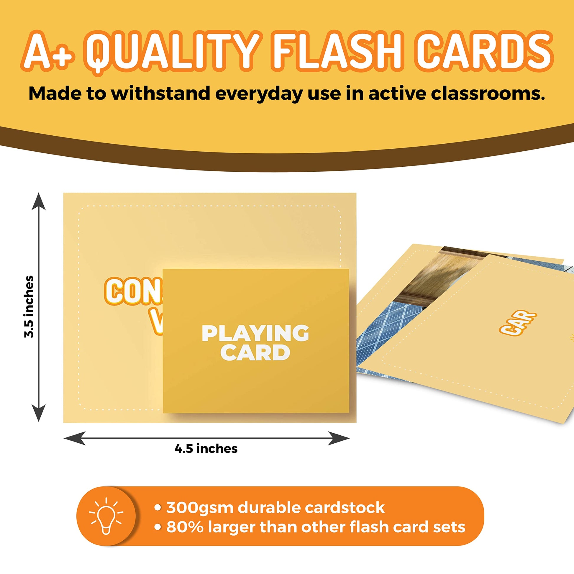 - Q: What size are the Noun Flash Cards and why is it beneficial? A: Each card measures 3.5 inches by 4.5 inches, making them 80% larger than standard flash cards. This size is beneficial for children and adults with fine motor skill issues, as it makes them easier to hold and manipulate during learning activities.