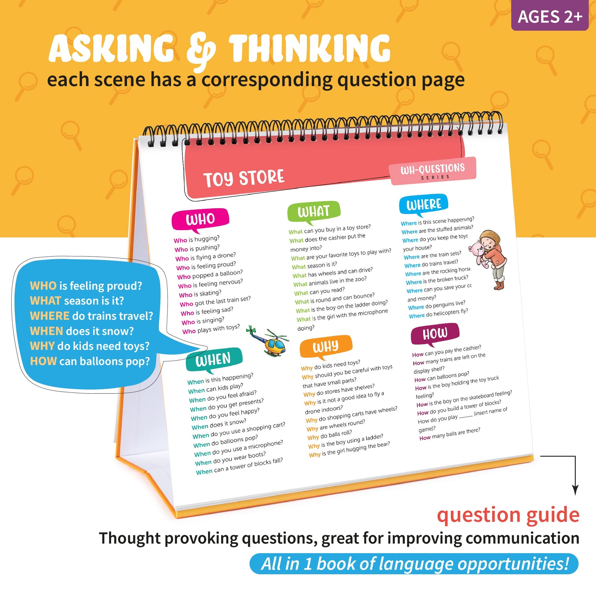 The Perfect Educational Tool For Improving Kids' Language Skills! These Picture Flipbooks Features Detailed Picture Scenes, Each Accompanied By A Wh Thinking Question Guide, To Help Kids Analyze Emotions, Prepositions, Actions, And More. The Kids Books Includes Prompt Cards To Guide Children Through Each Page And Comes With A Reusable Talk Bubble Sticker Page To Highlight Different Learning Concepts. The Pages Are Thick, Laminated, And Wipeable, Making Them Durable And Perfect For On-The-Go Use. Great For Parents, Teachers, Homeschoolers, Speech Therapists, And Autism Aba Practitioners