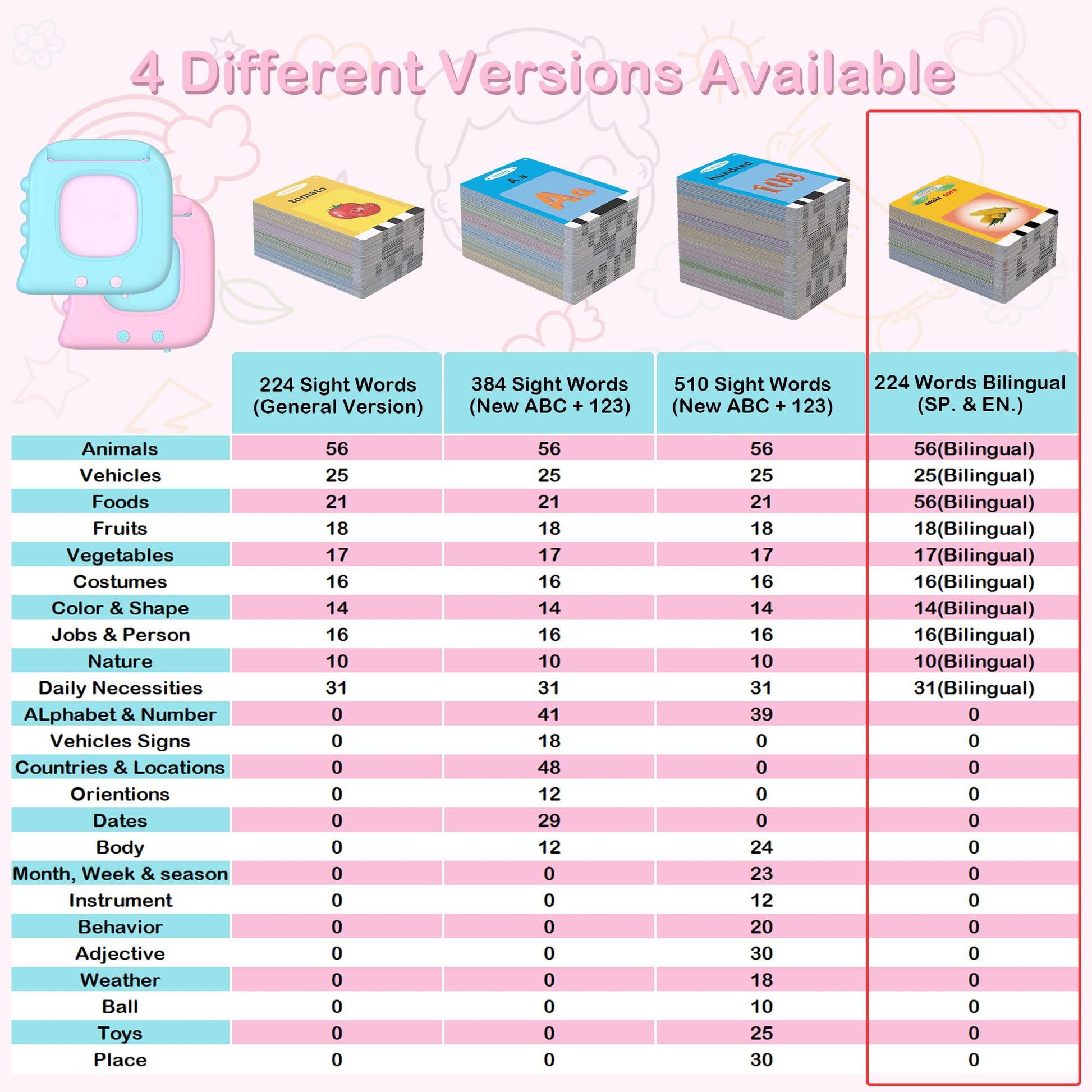 Talking Flash Cards For Toddlers 2-4 Years Bilingual Spanish English, Speech Therapy Toys, Autism Sensory Toys, Preschool Educational Learning 224 Sight Words Flash Cards For Girls.