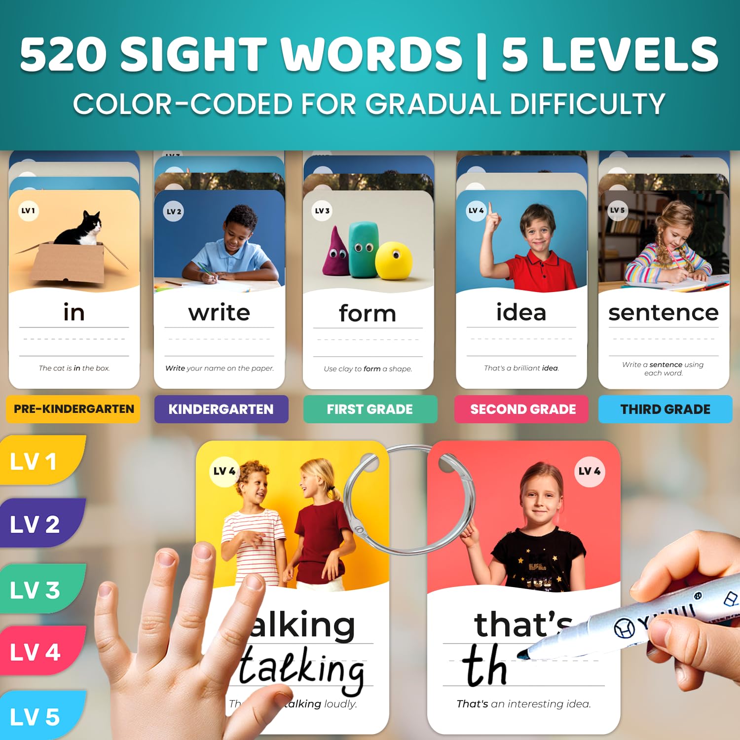QUOKKA 520 Sight Words Flash Cards for Kids Adults - from Pre-K to 3rd Grade | 5 Levels, Bold Font, Jumbo Size, Dry Erase Reusable Cards with Realistic Images & Rings | Based on Dolch & Fry Word Lists