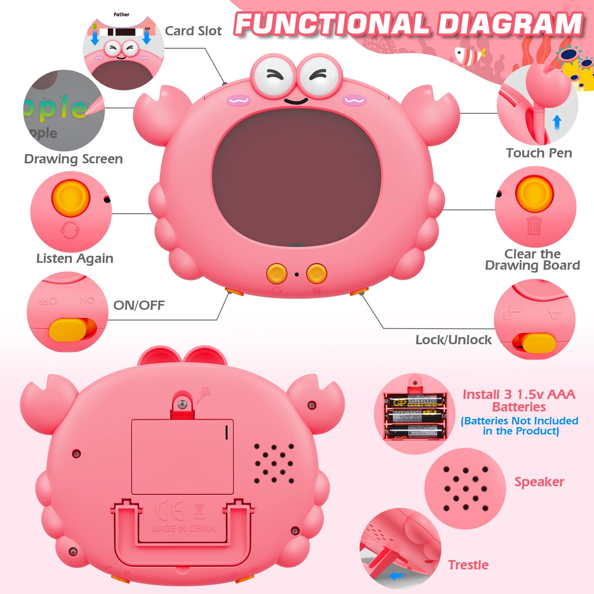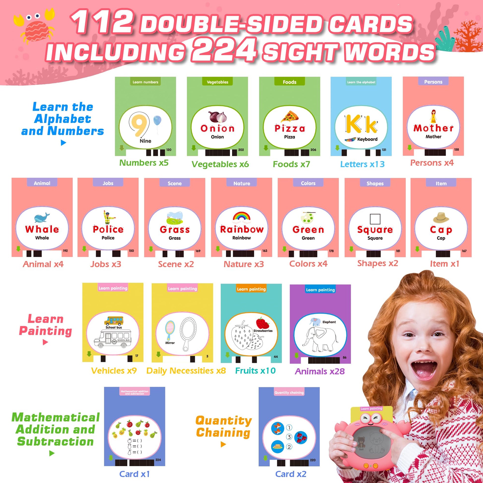 - Q: How does the Talking Flash Cards help with learning? A: These flash cards cover various topics such as animals, transportation, and shapes. Kids can write, draw, and practice math, enhancing their cognitive skills, vocabulary, and auditory learning.