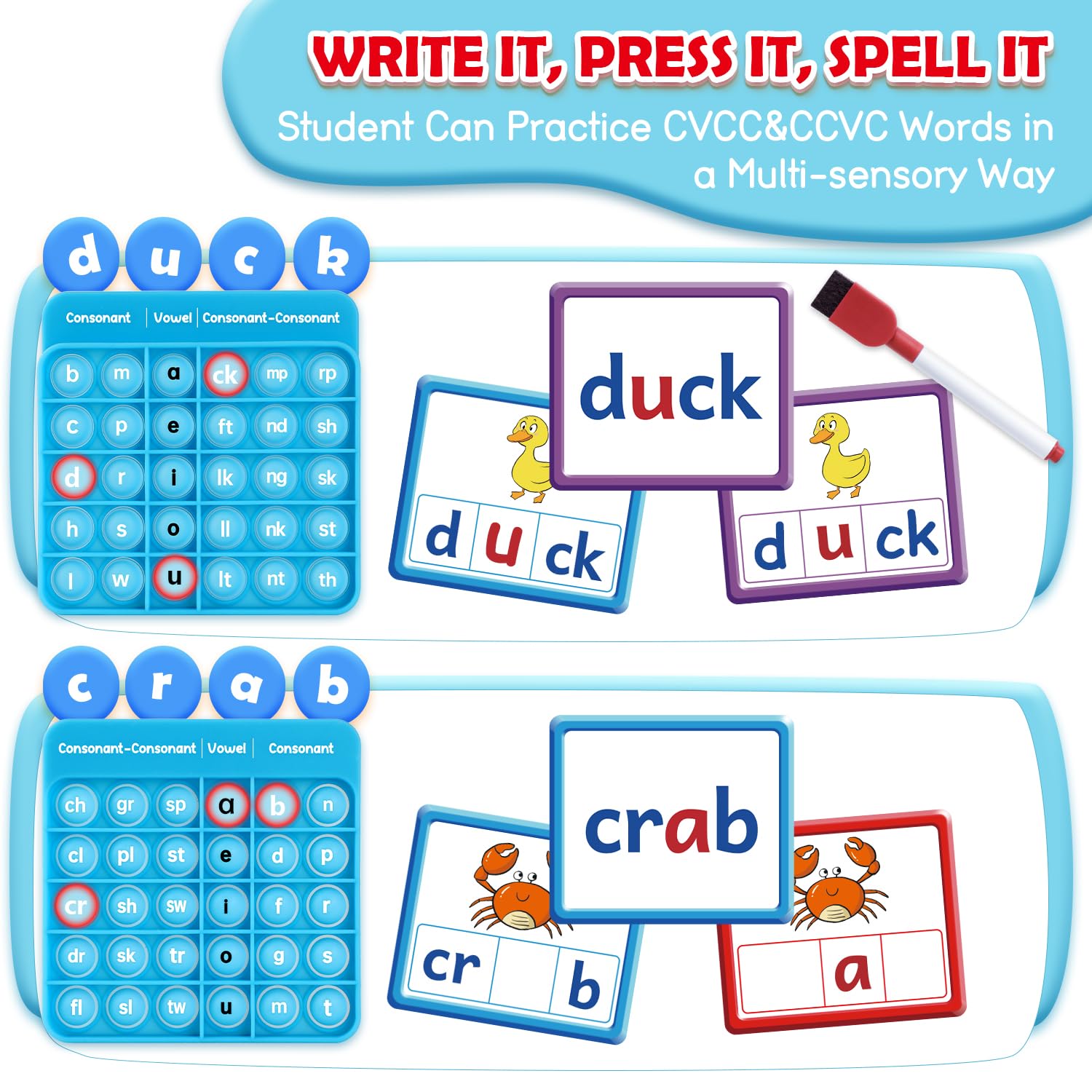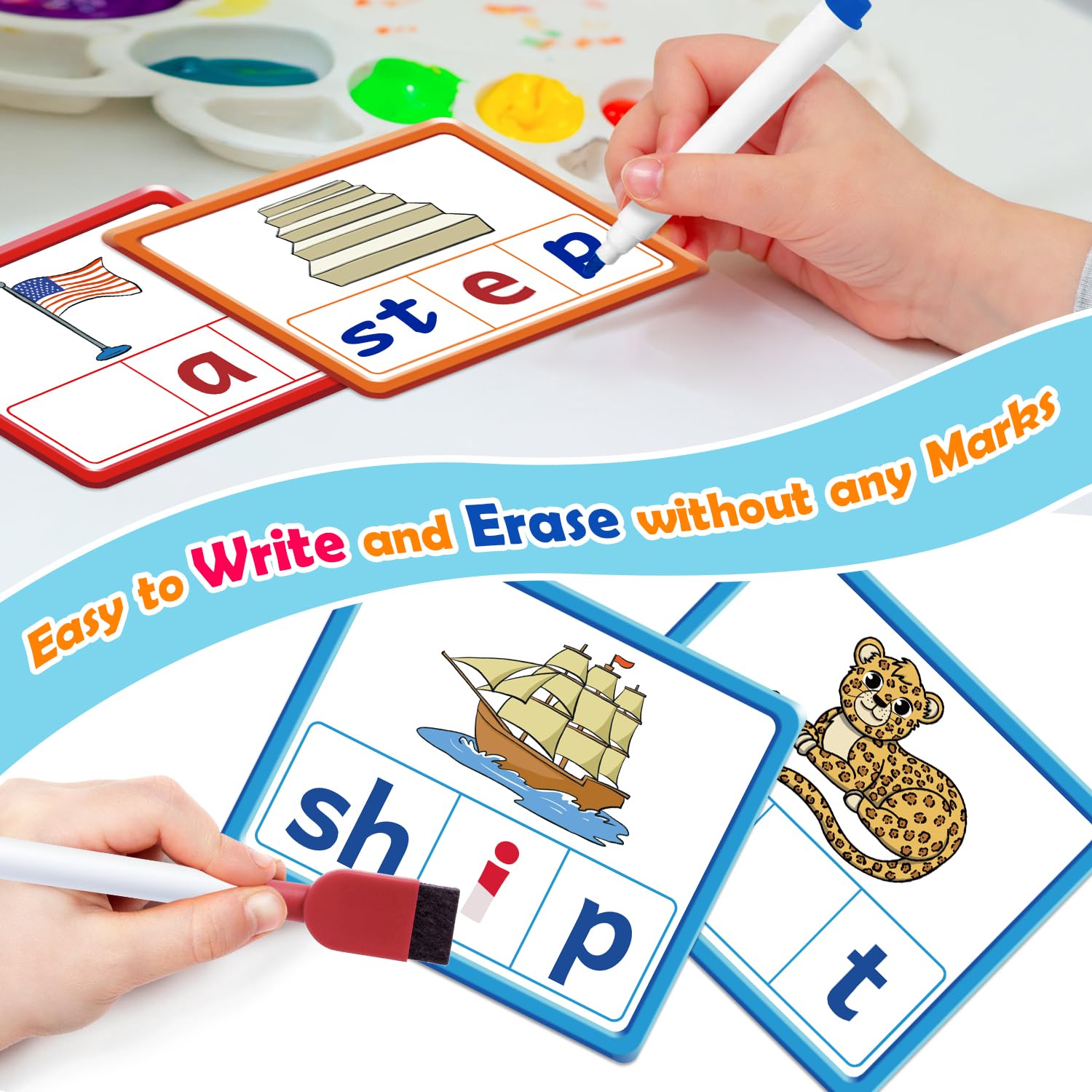 - What's Included: The package contains 1 board, 150 double-sided word builder cards with illustrations that match CVCC & CCVC words, and 4 dry-erase markers (2 blue & 2 red). Kids can write, erase, and repeat, ensuring endless learning opportunities.