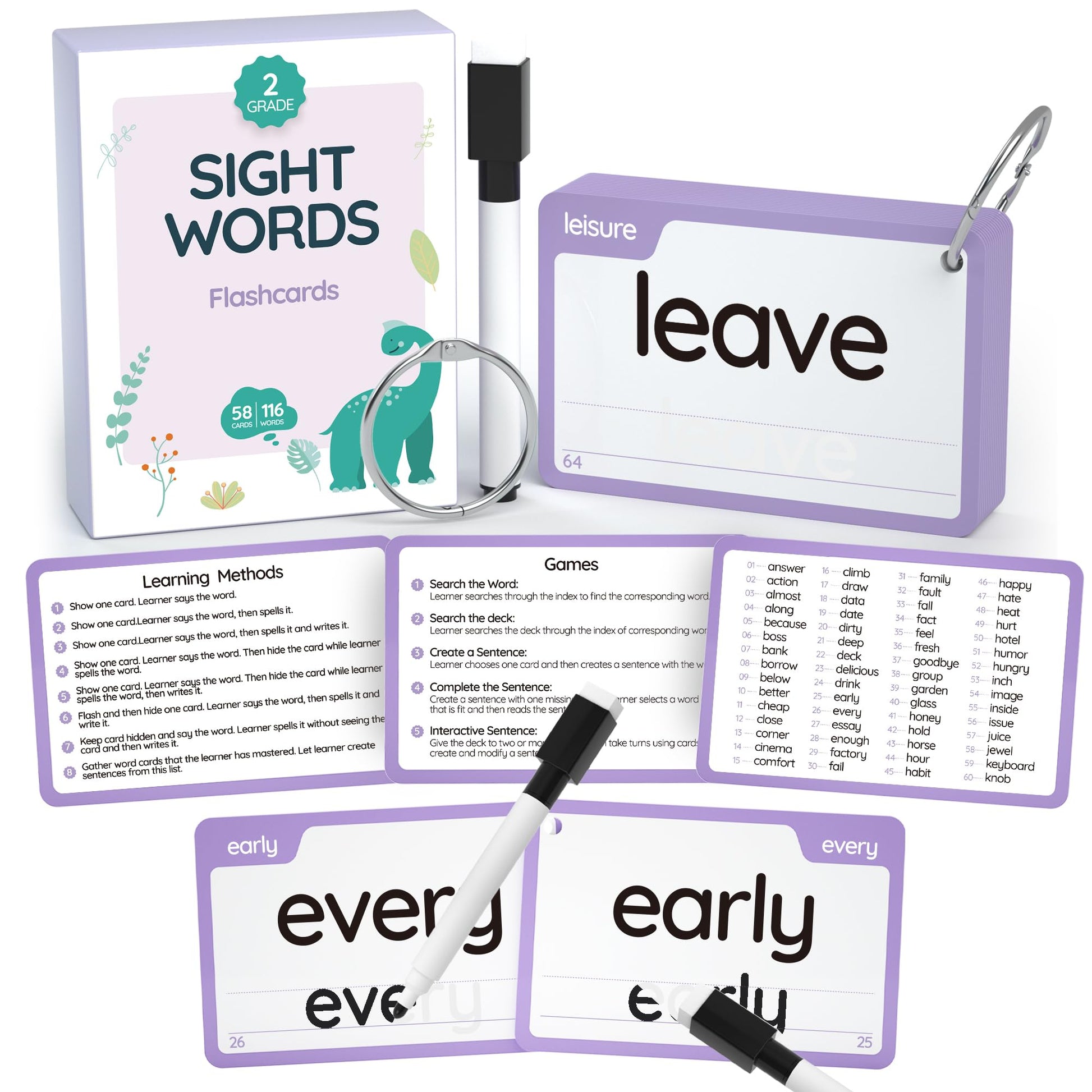 Wjpc 58 Cards, 116Pcs High Frequency Sight Words Flash Cards (Second-Grade), 1St, 2Nd, 3Rd Grade, 6,7,8,9 Years Ages Kids Boys Girls Homeschool Phonics Learning Cards To Read, Write.