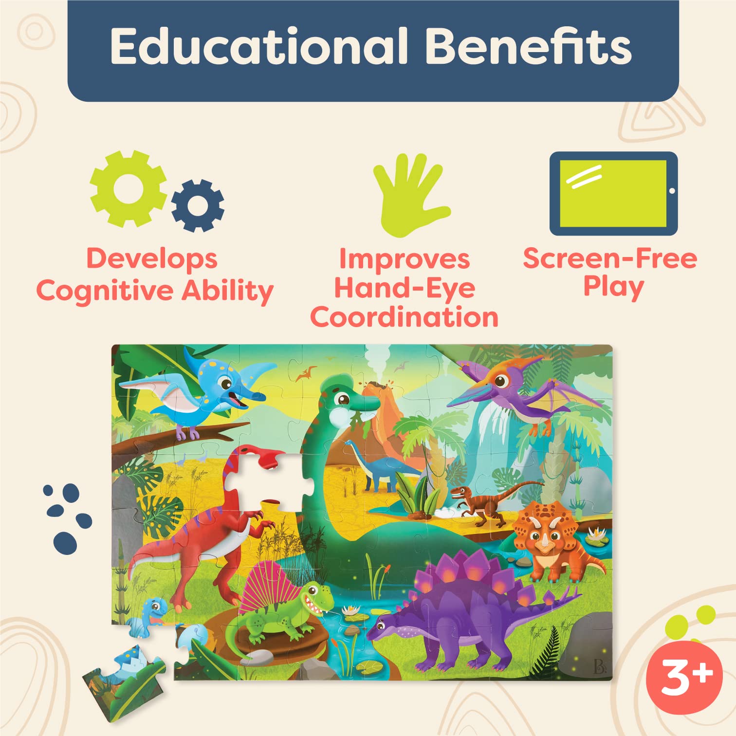 - Q: What educational benefits does this dinosaur puzzle offer? A: As children assemble the puzzle, they learn about various dinosaurs while improving their dexterity, hand-eye coordination, and problem-solving skills.