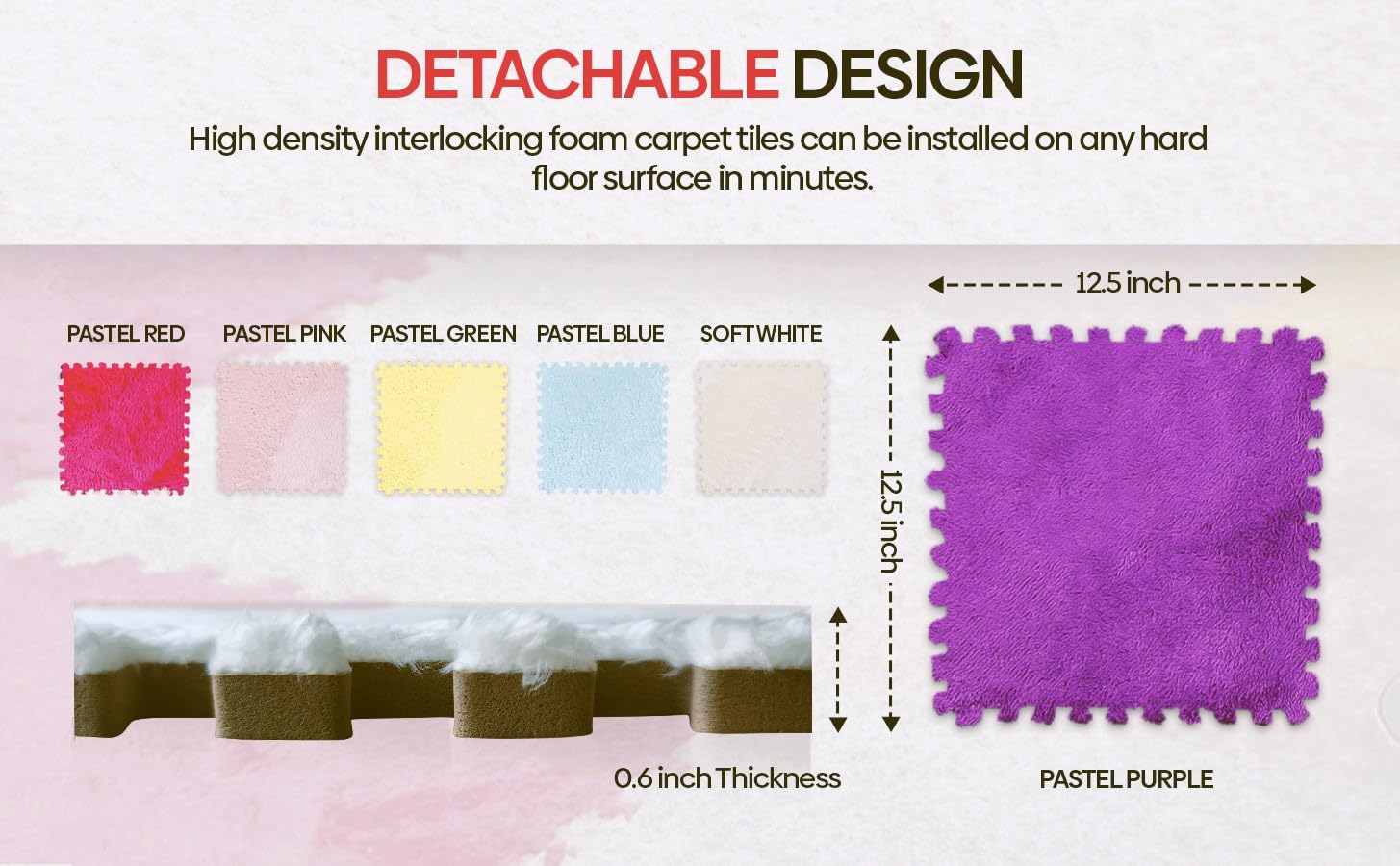- Q: What colors are available for the carpet squares? A: The carpet squares are available in a multi-color design, including gray, light brown, and white.