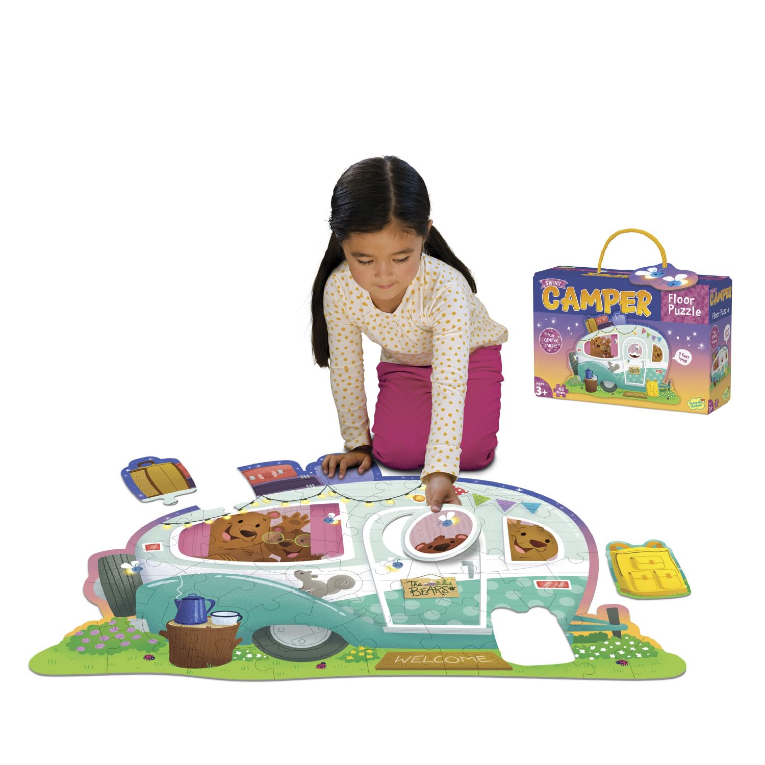 - Q: What age group is the Peaceable Kingdom Shiny Camper Floor Puzzle suitable for? A: The Peaceable Kingdom Shiny Camper Floor Puzzle is designed for kids ages 3 and up, making it an ideal choice for preschoolers and young children.