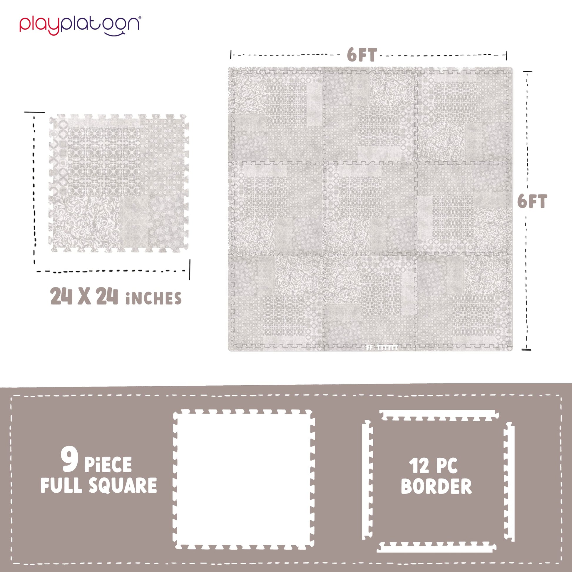 100% Non-Toxic Made With Certified Non-Toxic Eva Foam, Our Play Mats Are Completely Bpa, Phthalate, Lead And Pvc Free. Extra Thick, Extra Large Pieces 5/8 Inch (15Mm) Thick Tiles Provide Extra Comfort And Shock Absorption. Large 24 X 24 Inch Pieces Cover More Floor. Stylish Design This Neutral Patterned Gray Play Mat Provides A Safe And Inviting Surface For Your Little One While Enhancing The Look Of Your Playroom, Exercise Room, Daycare Or School. Built To Last Made With Extra-Durable, Water-Resistant Foam, These Kids Play Mat Pieces Will Last You And Your Family For Years. Endless Pattern Combinations Mix And Match The Nine Uniquely Patterned Toddler Play Mat Pieces To Customize Your Space.