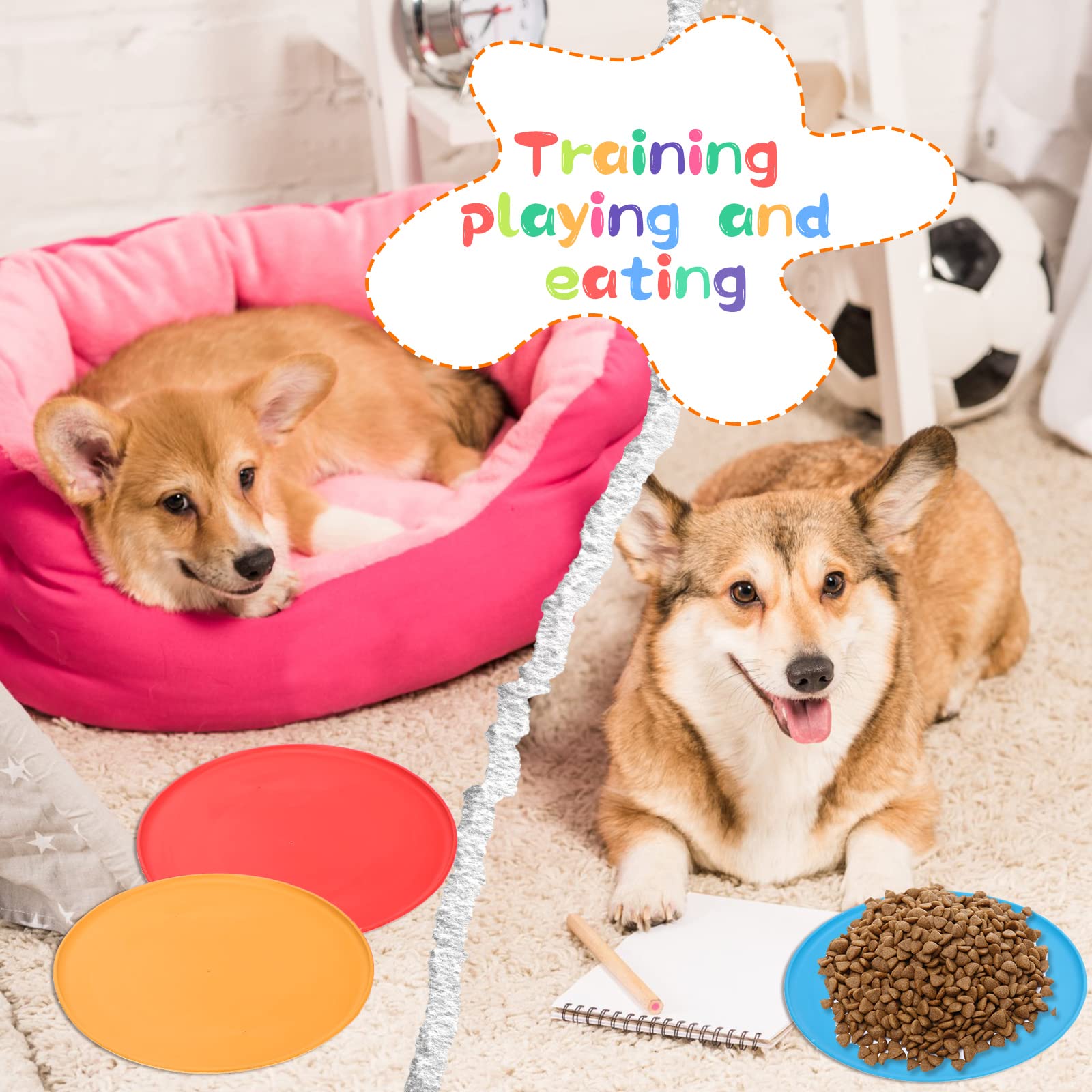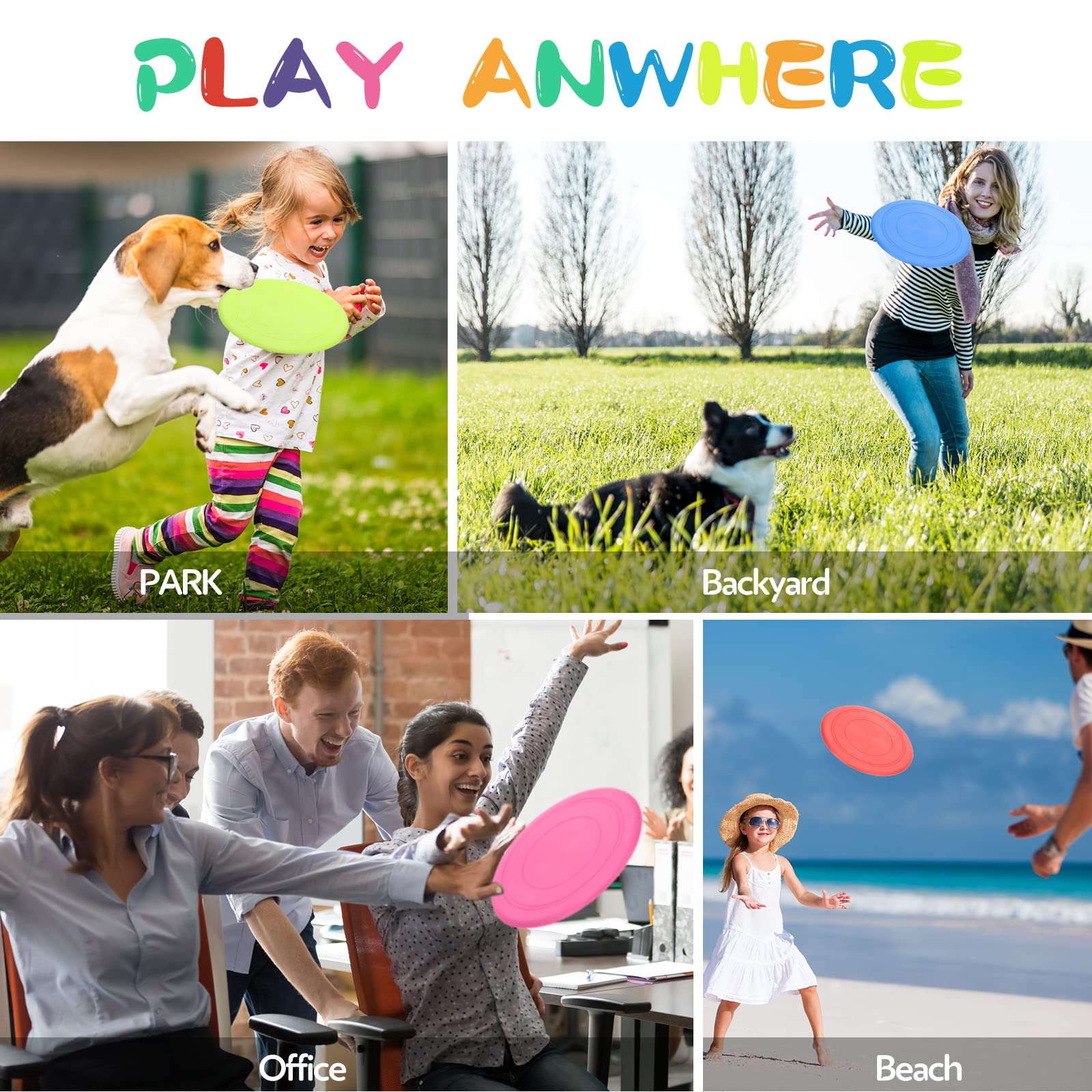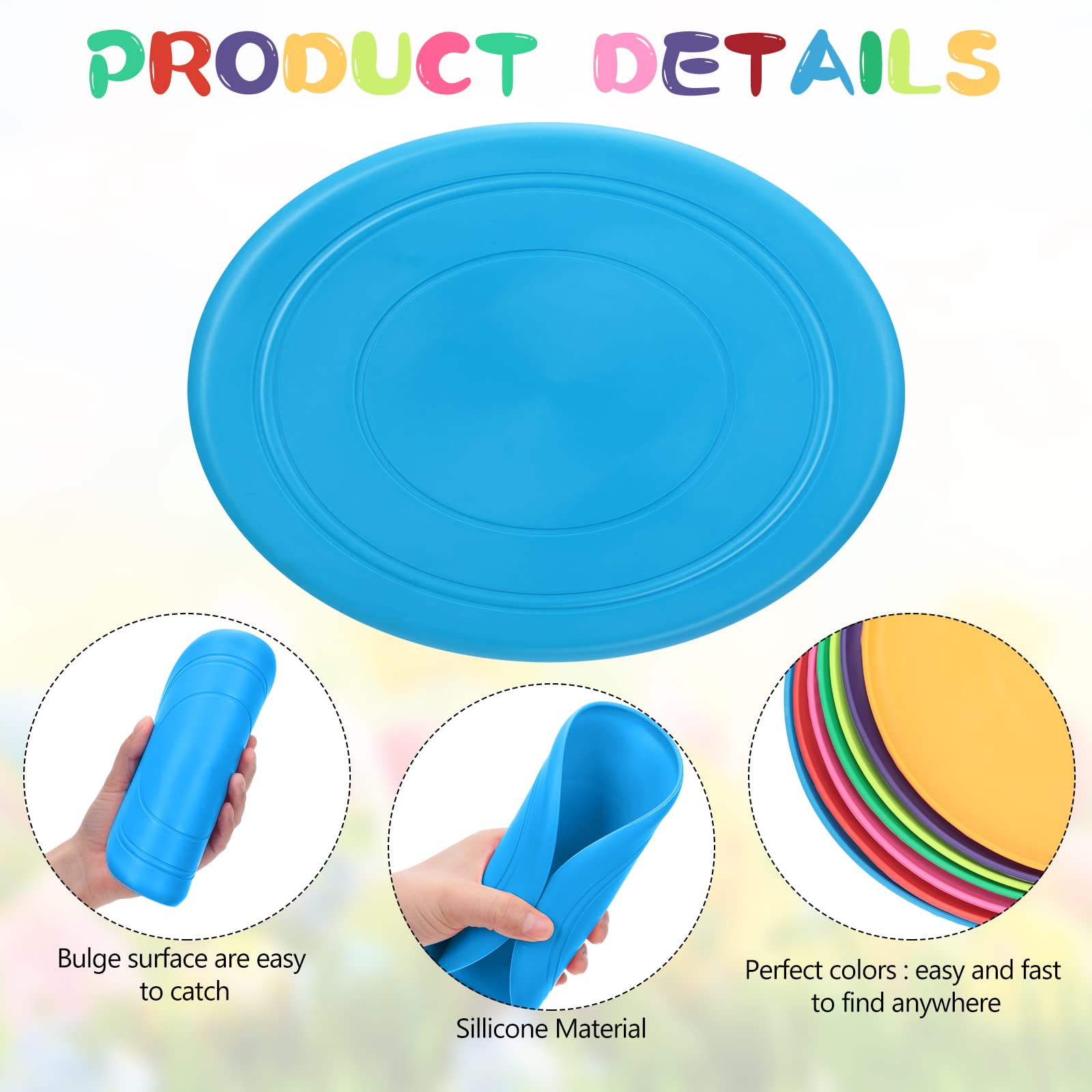 Features: The pet flying disc is designed with rounded edges, so that children can easily grasp it, and it will not cause discomfort if it is accidentally dropped on the body. In outdoor games, it flies straighter, more stable, and is easier to throw and catch. You can give it to your close friend, girlfriend or boyfriend, relatives, colleagues, classmates, neighbors as an exquisite gift, bring them a lot of fun and enhance your relationship. Specification: Material: Silicone Color: fruit green, green, red, blue, purple, orange, rose Size: About 7 inches/17.5 centimeters in diameter Quantity: 56 pieces The package includes: 56 x flying discs Note: Manual measurement, please allow slight size error. Due to different screen displays, there may be slight differences in color. Suitable for children over 3 years old.