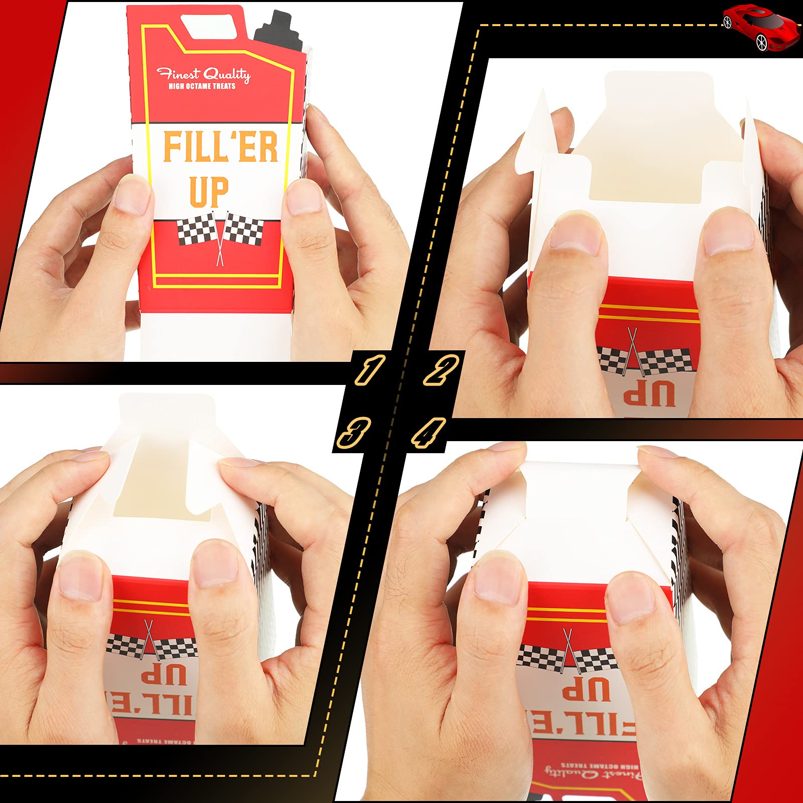 - Q: Are these racing popcorn treat boxes easy to assemble? A: Yes, the racing snack boxes are designed for easy assembly. Simply press both sides of the bottom, press down the backing paper, and insert the rest of the paper into the slot to complete the setup.