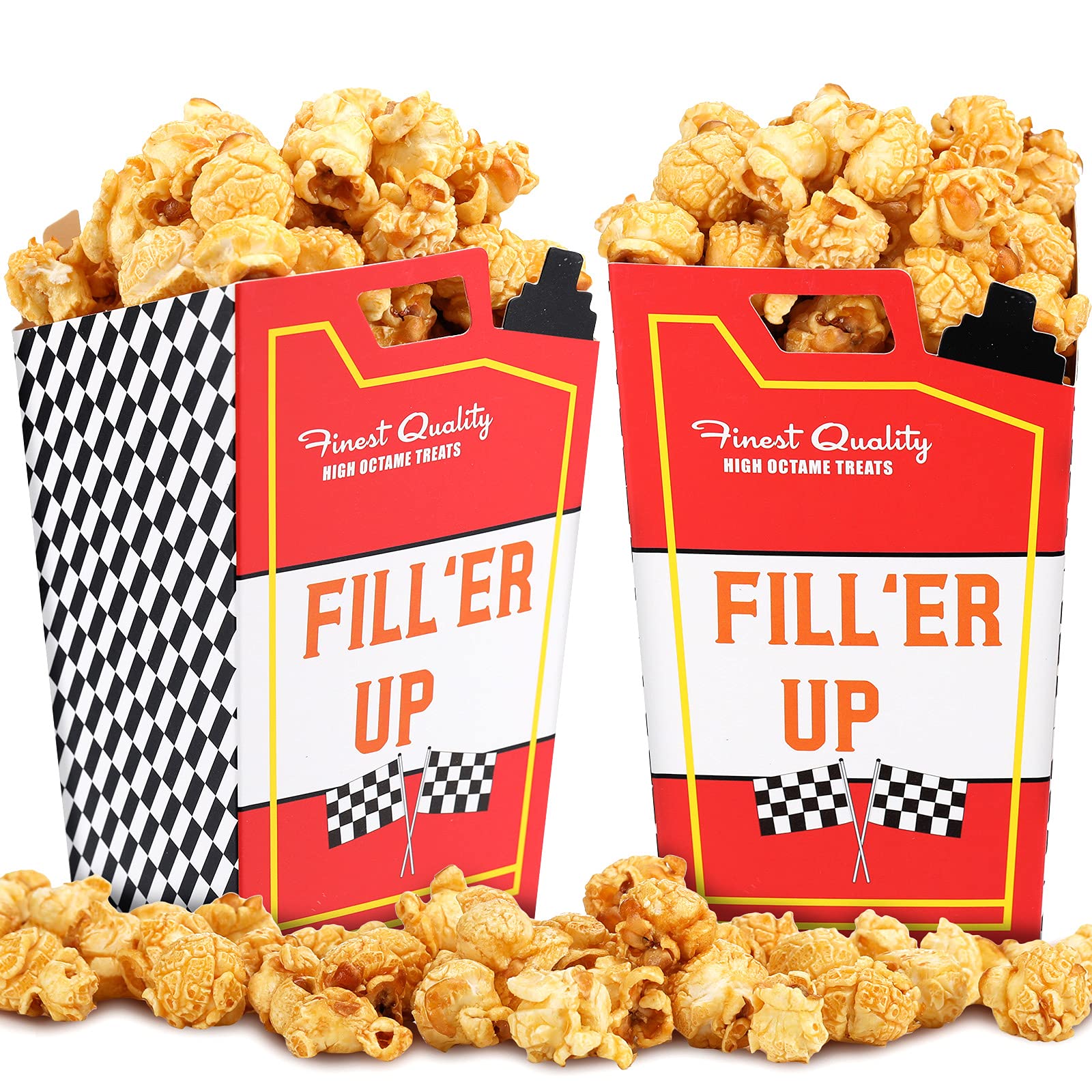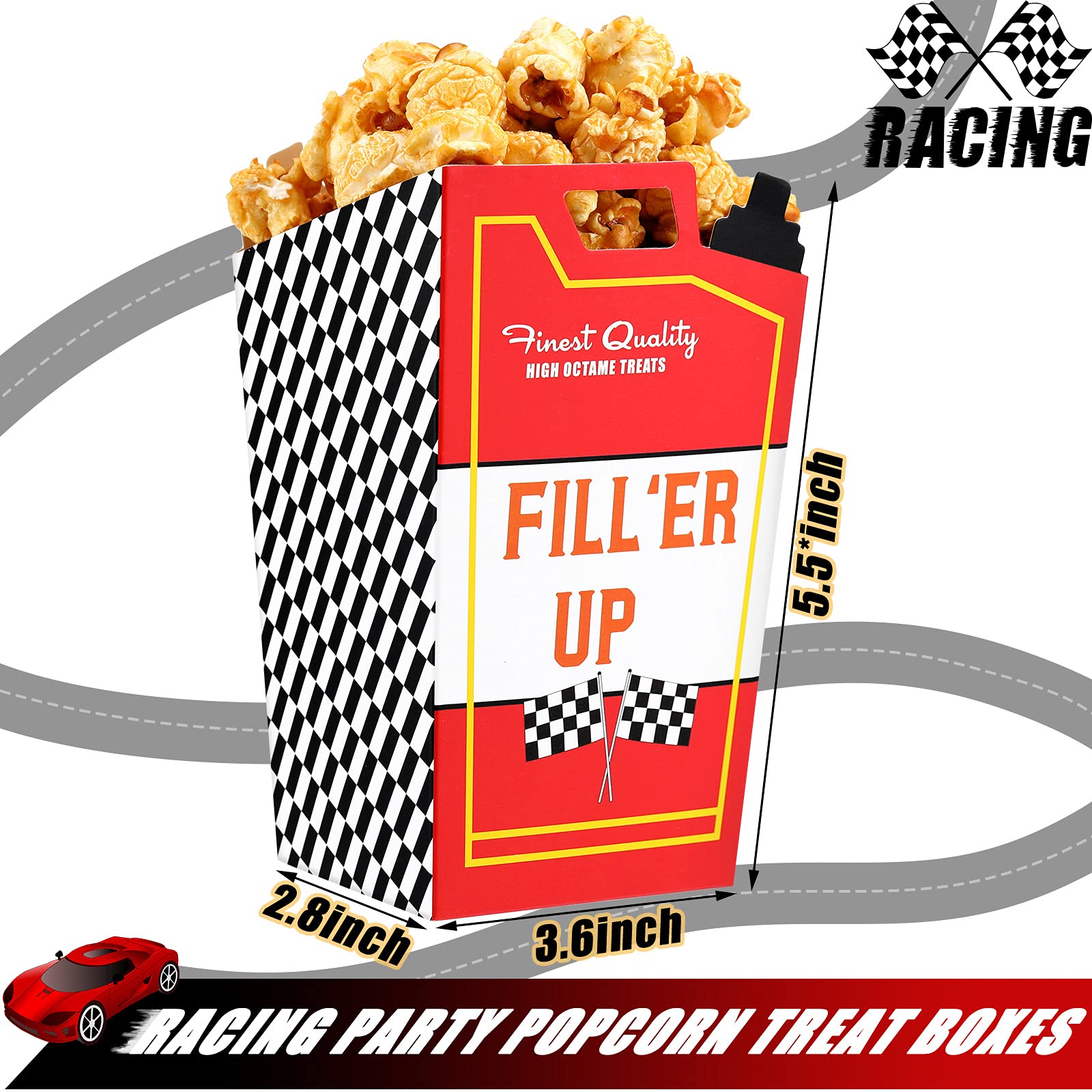 - Q: How many popcorn boxes are included in the package? A: The package includes 24 pieces of racing popcorn favor boxes, providing a sufficient quantity for your party needs.