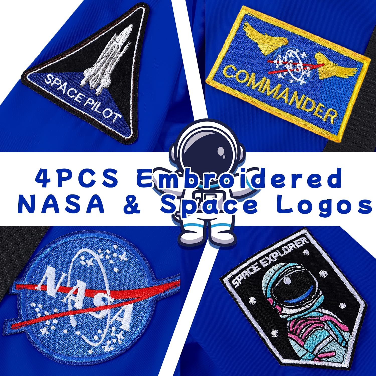 - Q: Does the astronaut costume include authentic NASA details? A: Yes, the Aoiviss Astronaut Costume features an embroidered NASA logo, NASA COMMANDER logo, and various space-themed patches on the chest and arms, adding an authentic touch to your child's space exploration experience.
