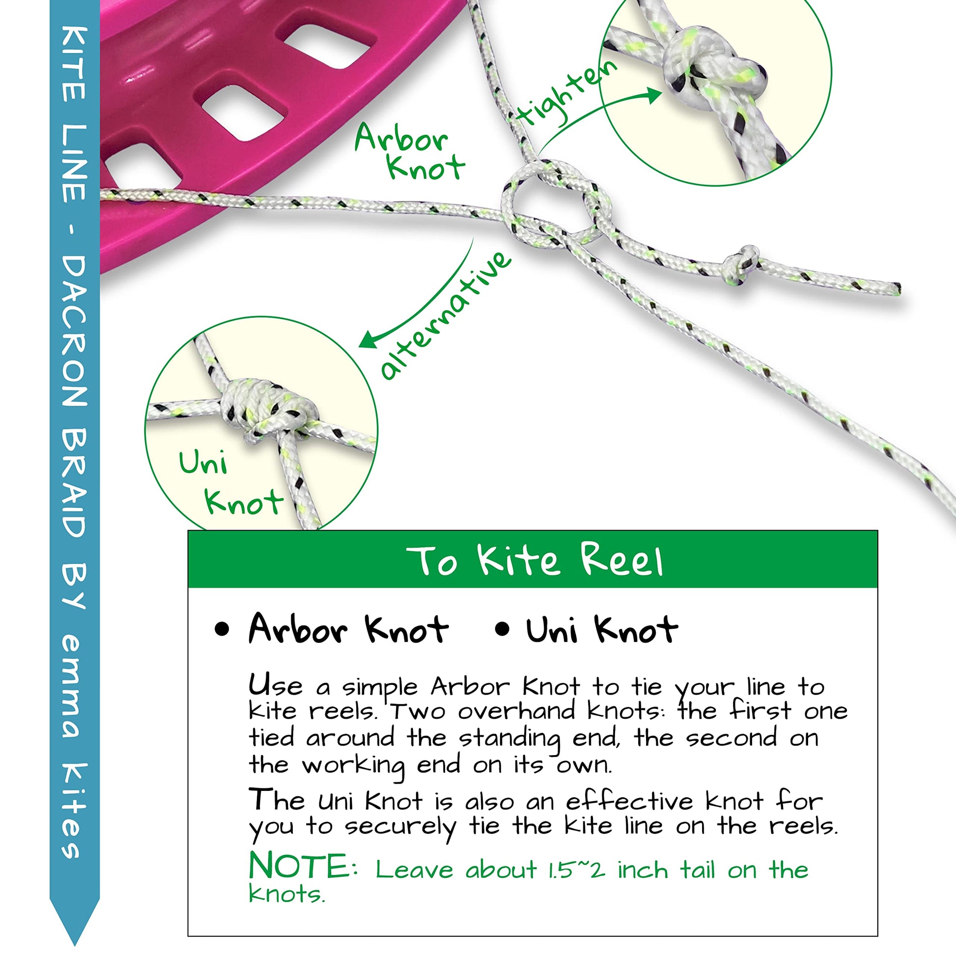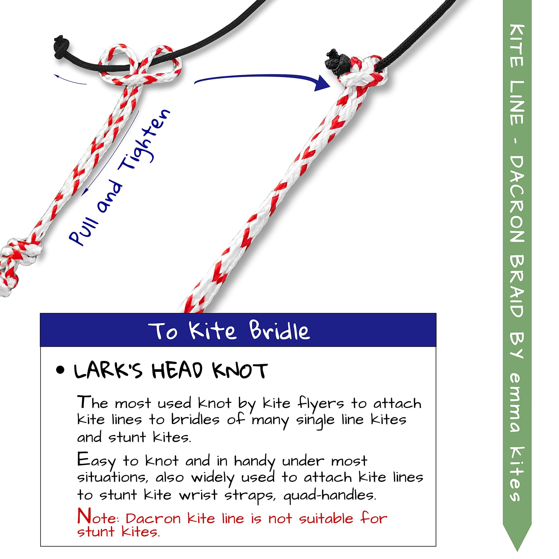 EMMAKITES 300lbs / 500lbs Dacron / Polyester String Diameter: 300lb: 2.5mm500lb: 3.1mmThere may be a little deviation due to hand measuring. Recommendation on how to choose kite lines for your kites! Please choose the right kite line for your precious kites. This is important! Whenever you fly a kite, please ensure the line can hold your kite and the wind. The following are recommendations for line/kite match ( kites are measured by wingspan): Kites below 7ft: 40lb~100lb Kites below 9ft: 100lb~150lb Kites below 13ft: 150lb ~ 250lb Kites below 16ft: 200lb~300lb Kites above 16ft: >300lb The recommendations above are for ordinary kite flying. It requires extra attention that kite shapes, kite spar material, the vent part of kites all details of kites will contribute to your decisions for kite lines. For example, delta kites of 7ft only need a 100lb kite line, but Rokkaku (hexagon kite) of 7ft needs a 250lb kite line since their venting methods are much different. The stronger the wind, the higher the line strength is required. Always choose a stronger kite line in high wind.