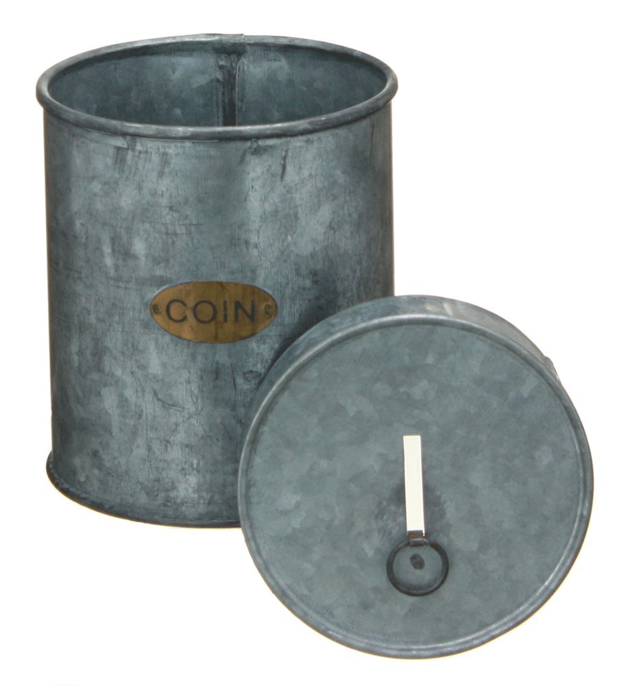 • Q: What is the size of the Galvanized Can Coin Bank? A: The Galvanized Can Coin Bank measures 4 inches in diameter and 5 inches in height, making it a medium-sized bank perfect for holding loose change.