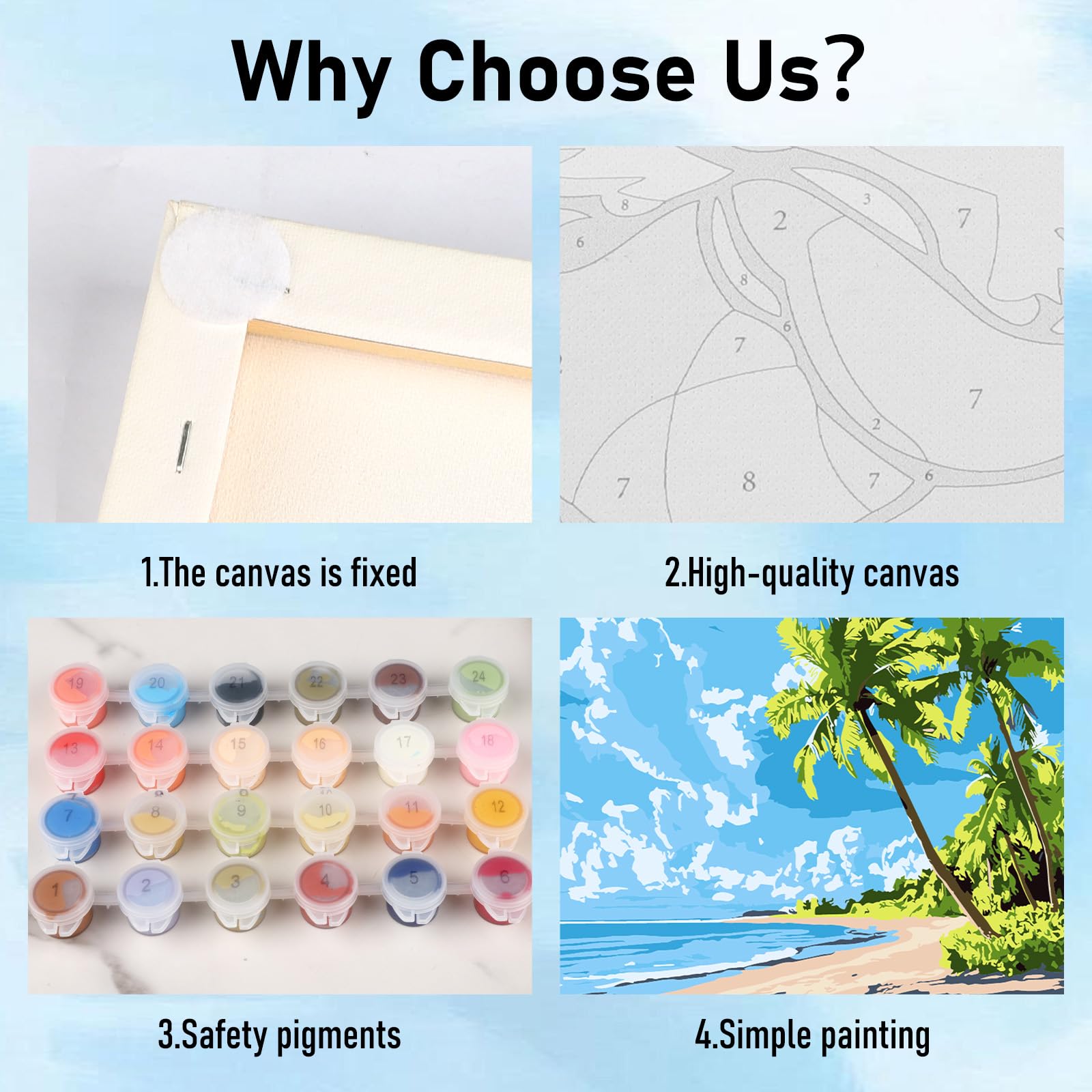 Why Choose Framed Paint by Numbers for Kids? 1.Paint by numbers for kids not only provides us with an artistic creation experience, but also converts paintings into lines and digital symbols through special processes, allowing people to create unique works of art with their own hands. 2.After completing your own work of art, you can hang it in your living room or bedroom so that your family and friends can appreciate your masterpiece, adding an artistic touch to the space. 3.Choosing to give your artwork to your family and friends allows them to witness the imagination and expressiveness of your creation. How do we get started with Paint by Numbers Kits? Creating with Paint by Number Kits is a straightforward process that can be broken down into the following steps: 1.Prepare Your Workspace: Set up a clean and well-lit area where you can comfortably work on your painting. 2.Organize Your Materials: Gather all the materials included in the kit, such as the canvas, paint pots, brushes, and instructions. 3.Study the Numbers: Examine the canvas and familiarize yourself with the numbered areas corresponding to different colors on the paint pots. 4.Start Painting: Begin by painting the numbered areas on the canvas with the corresponding colors from the paint pots. Follow the instructions to ensure accuracy. 5.Work in Sections: Work on one section of the canvas at a time, allowing each area to dry before moving on to the next to prevent smudging. 6.Add Details: As you progress, add finer details and shading to enhance the depth and realism of your painting. 7.Enjoy the Process: Take your time, relax, and enjoy the creative process as you watch your masterpiece come to life. 8.Display Your Artwork: Once completed and fully dried, you can proudly display your Paint by Numbers creation in your home or give it as a thoughtful Present.