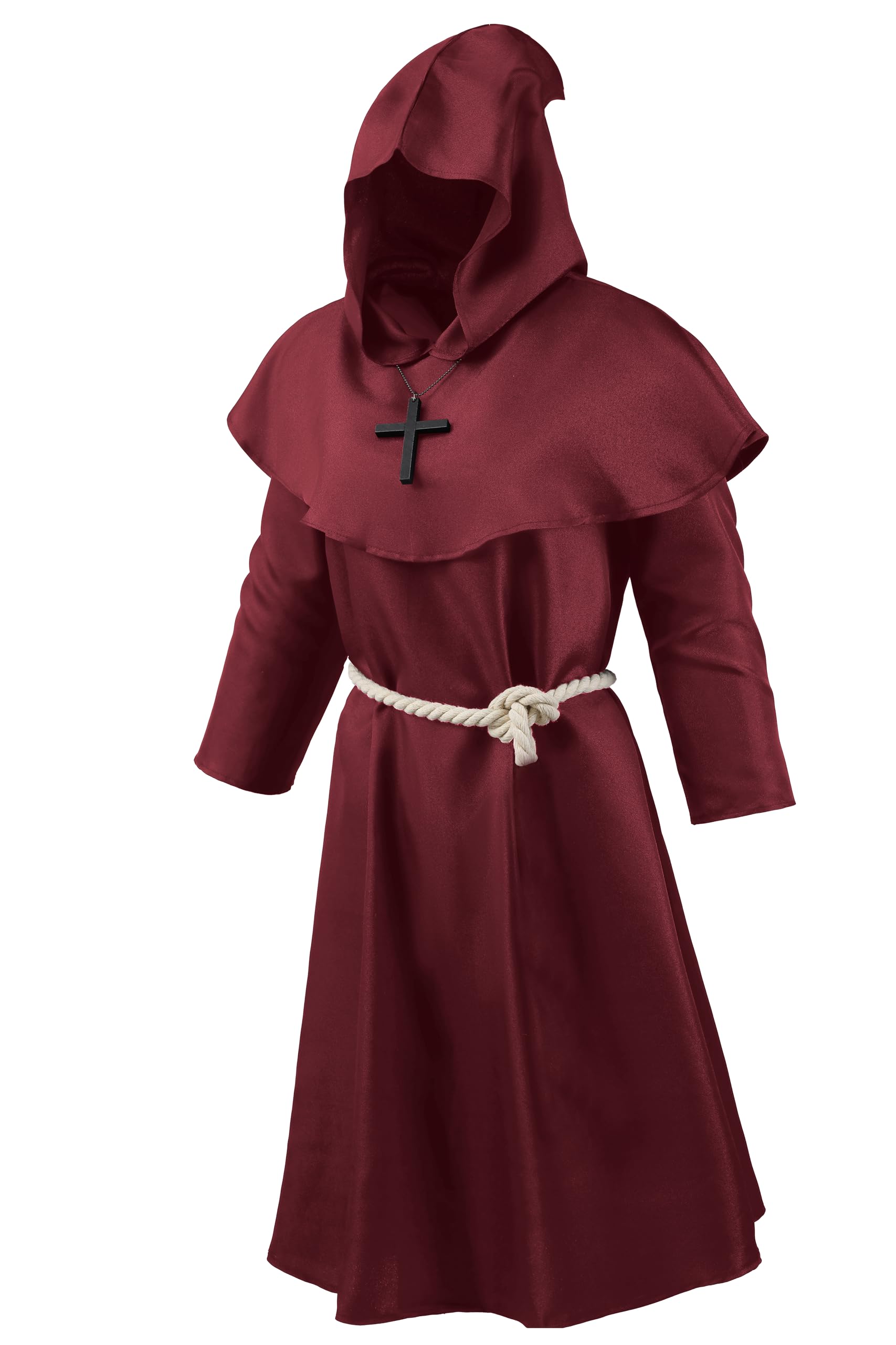 This kids' medieval hooded monk robe is inspired by a character from the movies. A man wearing the hooded monk robe, hiding his face, building up his strength with both hands, and possessing powerful magic or great power, looks very cool and mysterious. It's perfect for Halloween parties or other role-playing events. | Fabric: Uniform Cloth; Cross Necklace: Wood. This costume is crafted from deluxe polyester fabric for a comfortable wear during Halloween parties or themed events. | Order Including: Hooded Robe + Rope Belt + Cross Necklace. | The long, flowing hooded robe can be worn for various occasions such as Halloween, school events, cosplay parties, stage shows, masquerades, theme parties, and more. | Kids Medieval Friar Monk Robe Cosplay Hooded Cape Boys and Girls Costume Cloak For Halloween Parties.