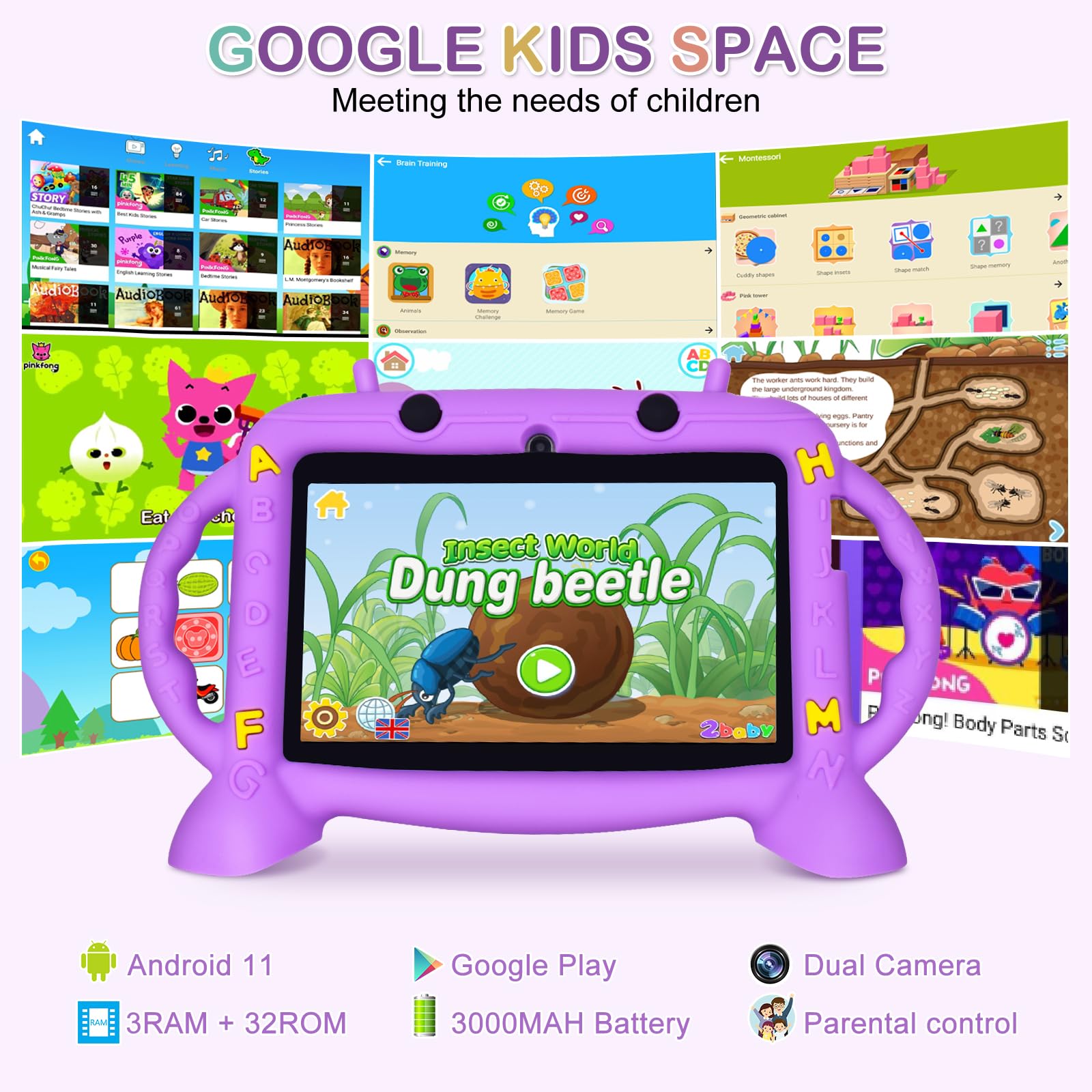 Kids Tablet, 7 inch Tablet for Kids 2-10, Educational Learning Toddler Tablet Android 11, 3GB RAM+32GB ROM Storage, Google Play