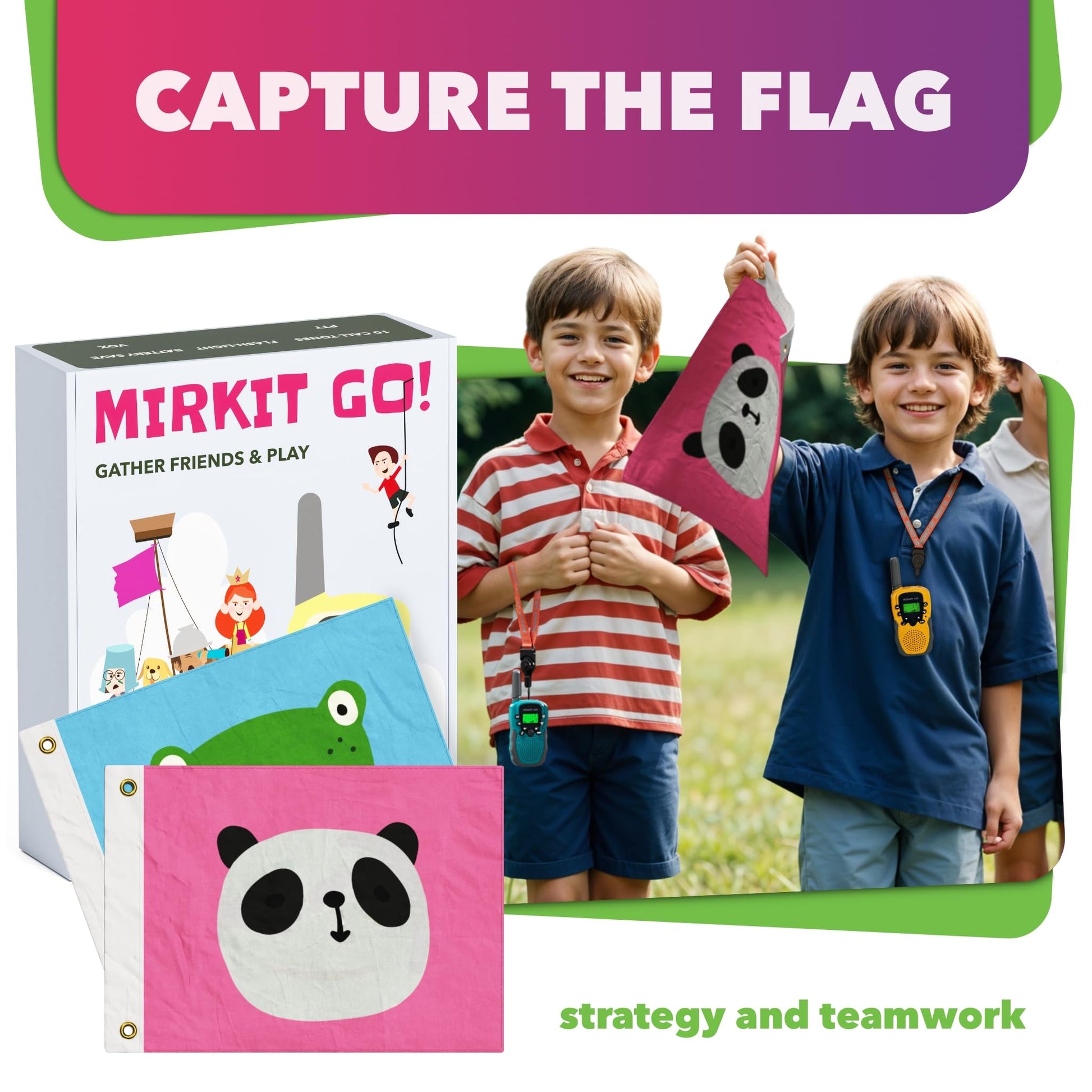 - Q: What games are included in the MIRKIT GO! set? A: The MIRKIT GO! set includes four classic games: Capture the Flag, Scavenger Hunt, Police Game, and Hide & Seek, providing a variety of engaging activities for kids.