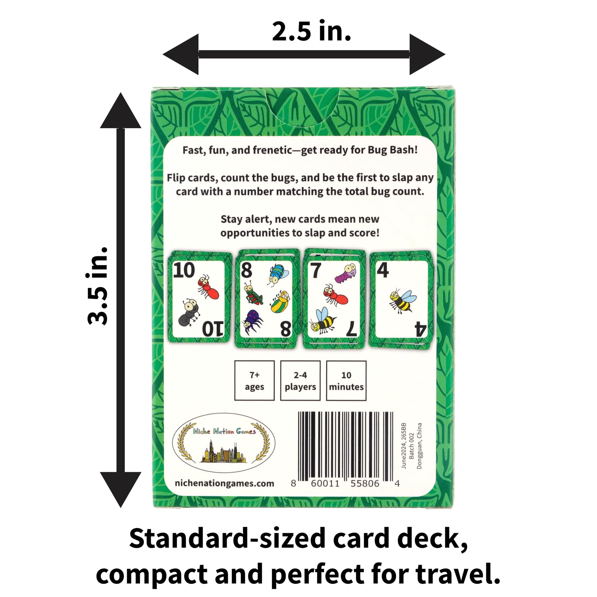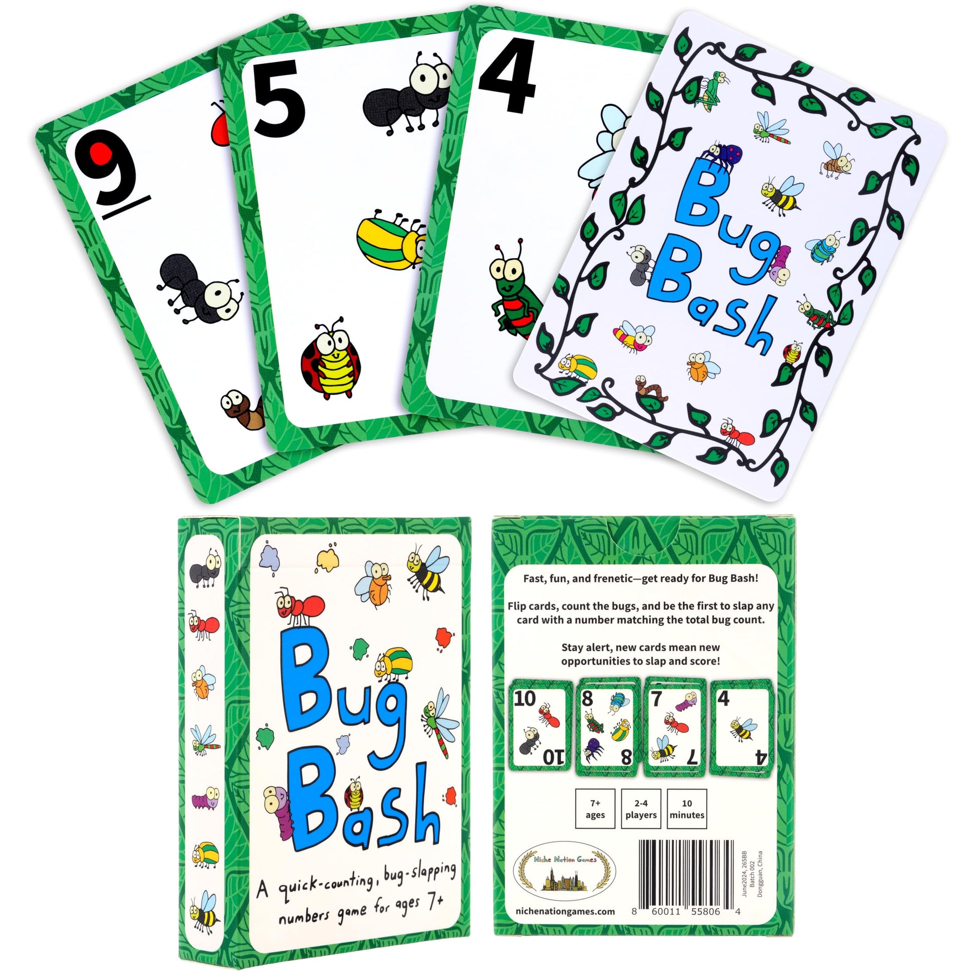 - Q: What are the components included in the Bug Bash game? A: The Bug Bash game includes a deck of 50 poker-size cards (2.5 x 3.5 inches) and instructional cards, all printed on premium 300gsm cardstock for durability.