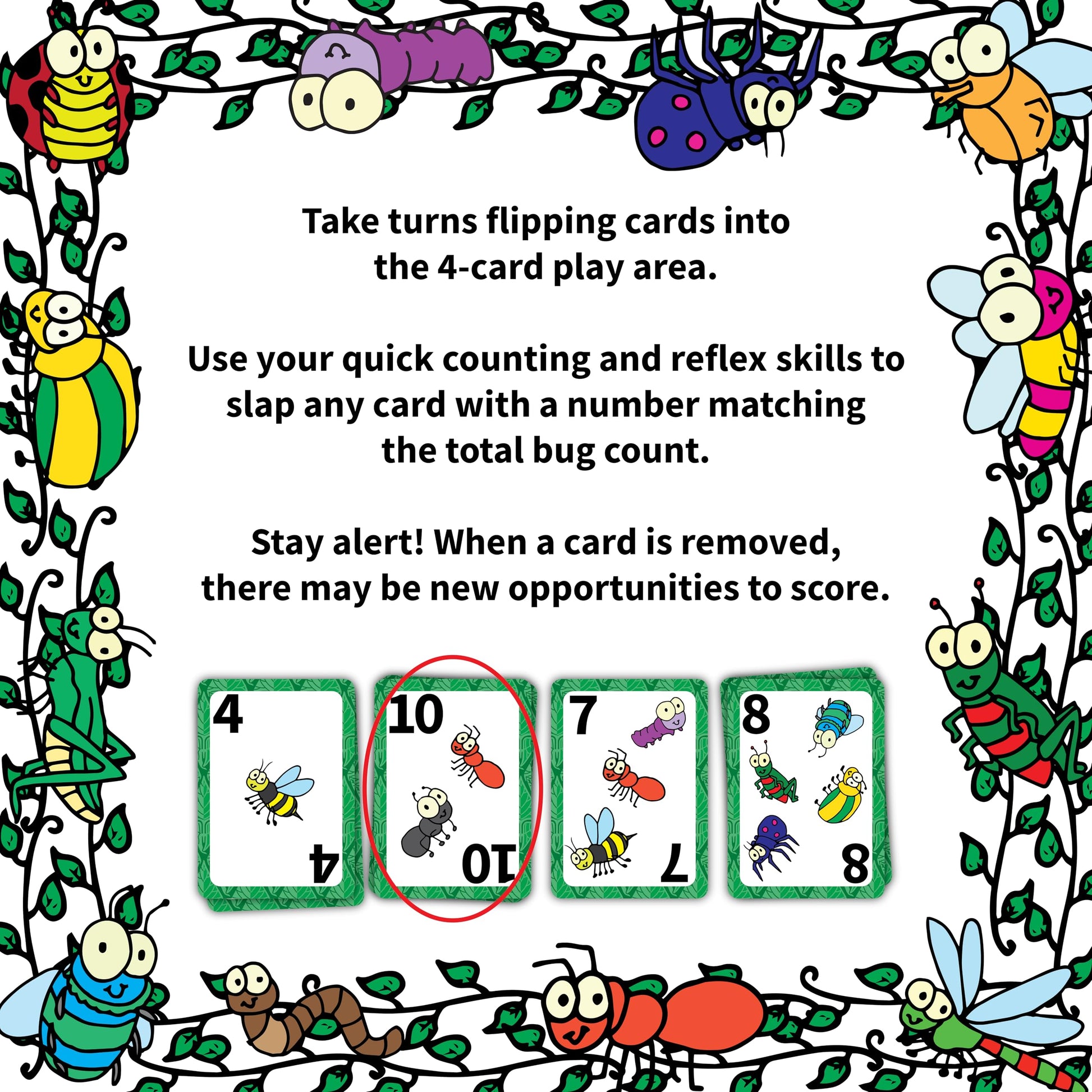 - FAST-PACED FUN: The game challenges players to flip cards and count bugs quickly. The first to slap the matching card wins, keeping everyone on their toes!