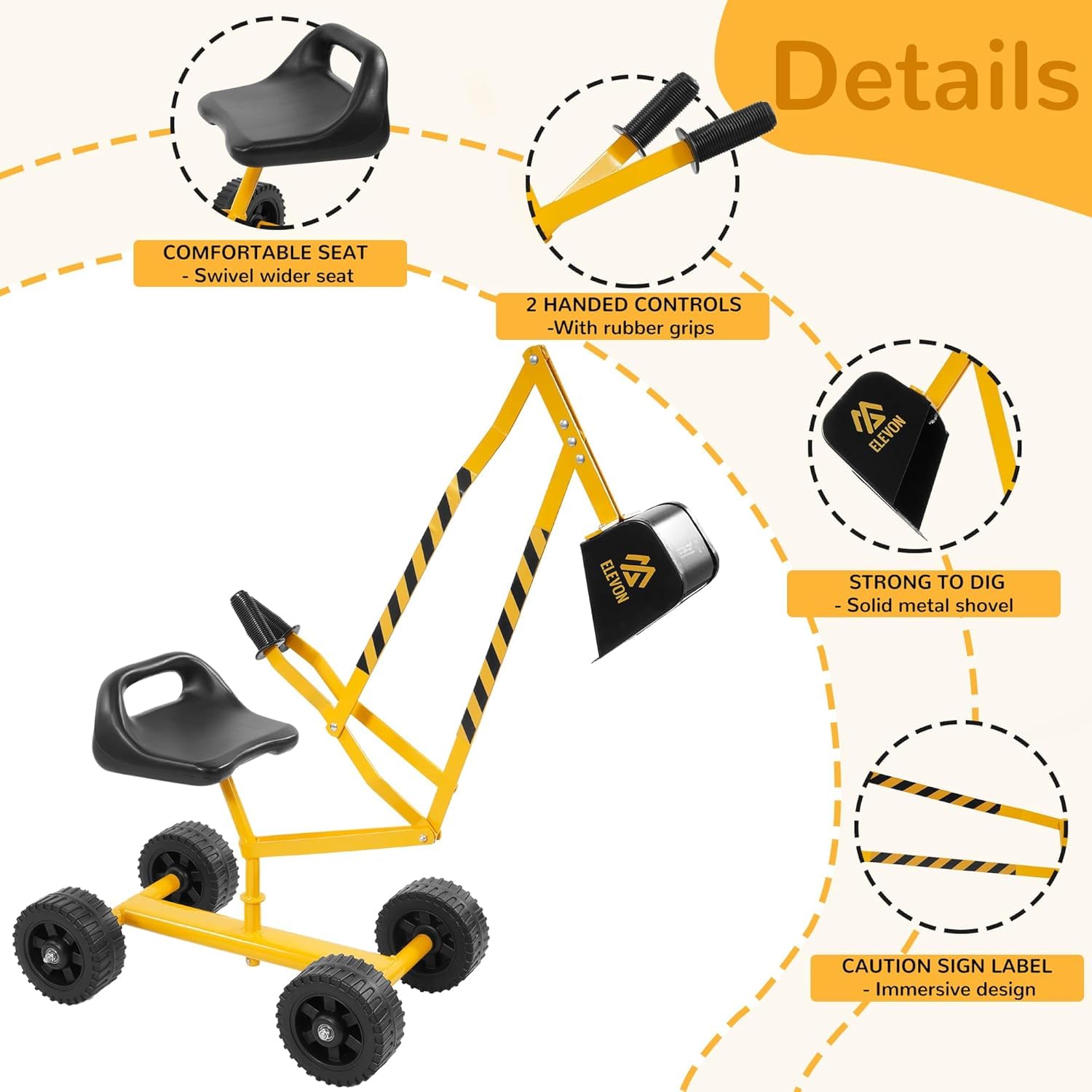 Easy Assembly: The outdoor toys comes with all parts necessary, accessories, tools, and detailed instructions for assembly. Product dimensions are (L x W x H): 21.25 x 14.57 x 47.64 inches, making it compact and easy to set up. With a 140lbs weight capacity. Our after sales team will help you if there are any problems | Excavator: Equipped with a 360-degree rotating mechanical arm and seat, our ride on excavator offers a realistic and immersive experience for children. They can easily manipulate and control robotic arms and learn basic teamwork skills while having fun together. Besides the beach in the summer, the excavator toy is also suitable with the fall leaves and the snow in the winter | Durable Frame with Wheels: Crafted from robust metal, our excavator toy ensures long-lasting durability. The sandbox toys with 4 easy-roll wheels, offers your kids more flexibility to play all around, on grass, gravel road, or sandy beach. With a 140lbs weight capacity, the four casters are durable, allowing your children to play on different grounds and providing a secure foundation | Sturdy and Safe Construction: Crafted from robust metal materials, excavator toy is built to withstand the play of energetic kids. The ride on excavator features rubberized handles for a comfortable grip. The design takes into consideration the ergonomic needs of kids, providing a safe and enjoyable experience | Promotes Cognitive and Physical Development: When children are exposed to our sand toys, they will learn about engineering principles. Excavator not only provides endless hours of fun, but also promotes important cognitive and physical development in children. Through joining in hands-on play, children can develop problem-solving skills, critical thinking abilities, their overall imagination