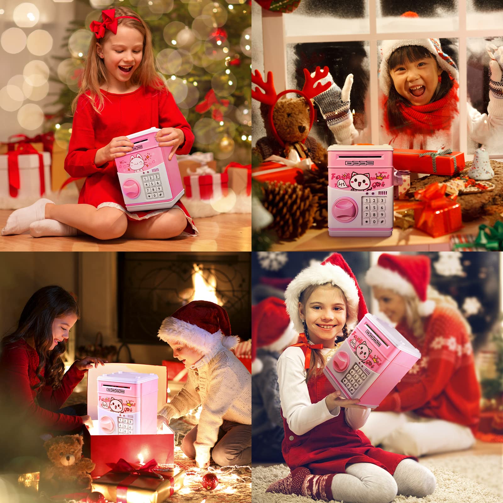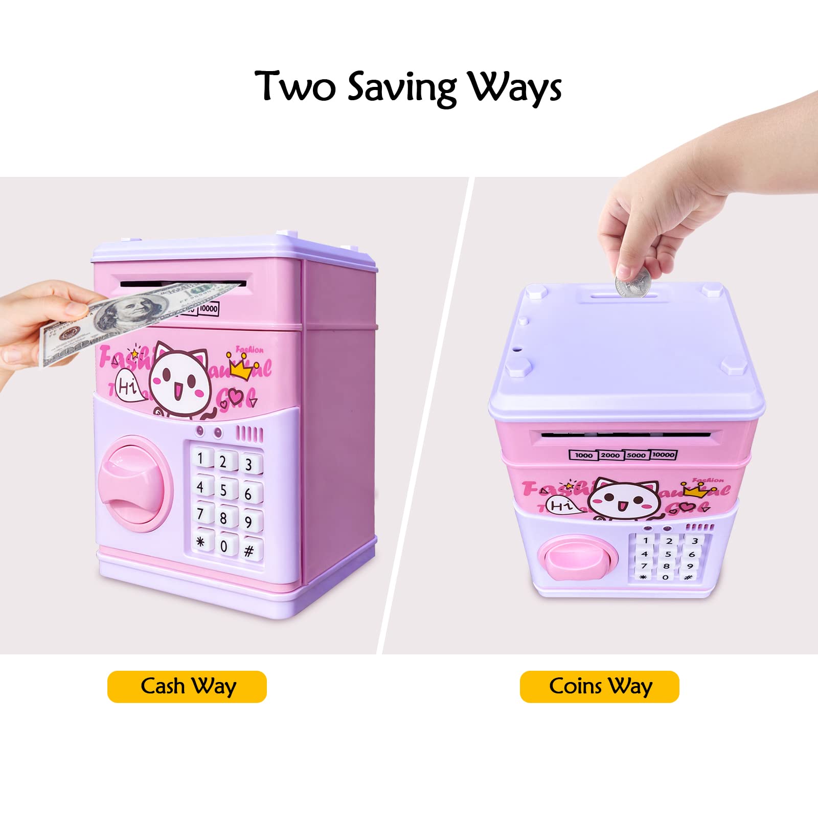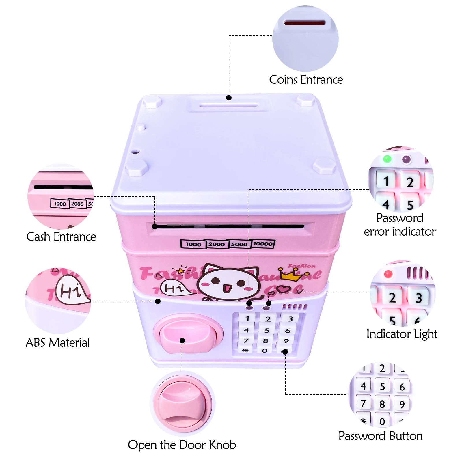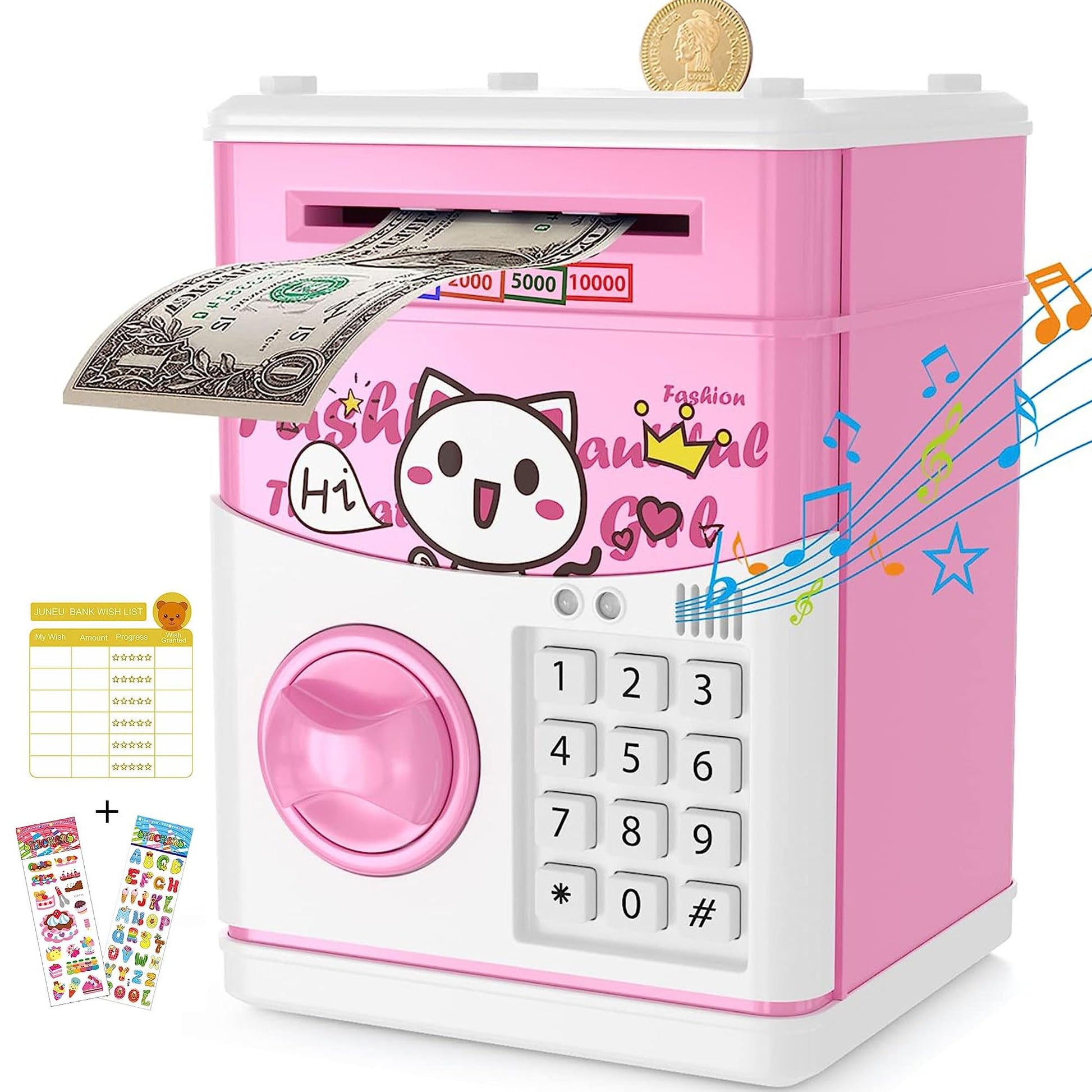 JUNEU Smiley Cat Electronic ATM Piggy Bank for Kids, Cash Coin Can with Stickers, Ideal Birthday Gift for Ages 5-12, Pink-A