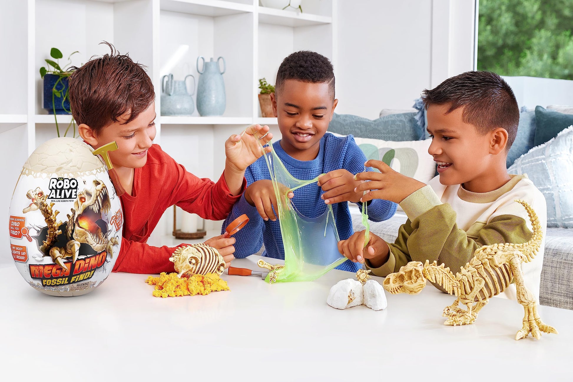 - Q: What is included in the Robo Alive Mega Dino Fossil Find kit? A: The Robo Alive Mega Dino Fossil Find kit includes everything you need to excavate dinosaur fossils, including rock, magma slime, and sand. It also comes with an information pamphlet to learn about the dinosaurs you discover.