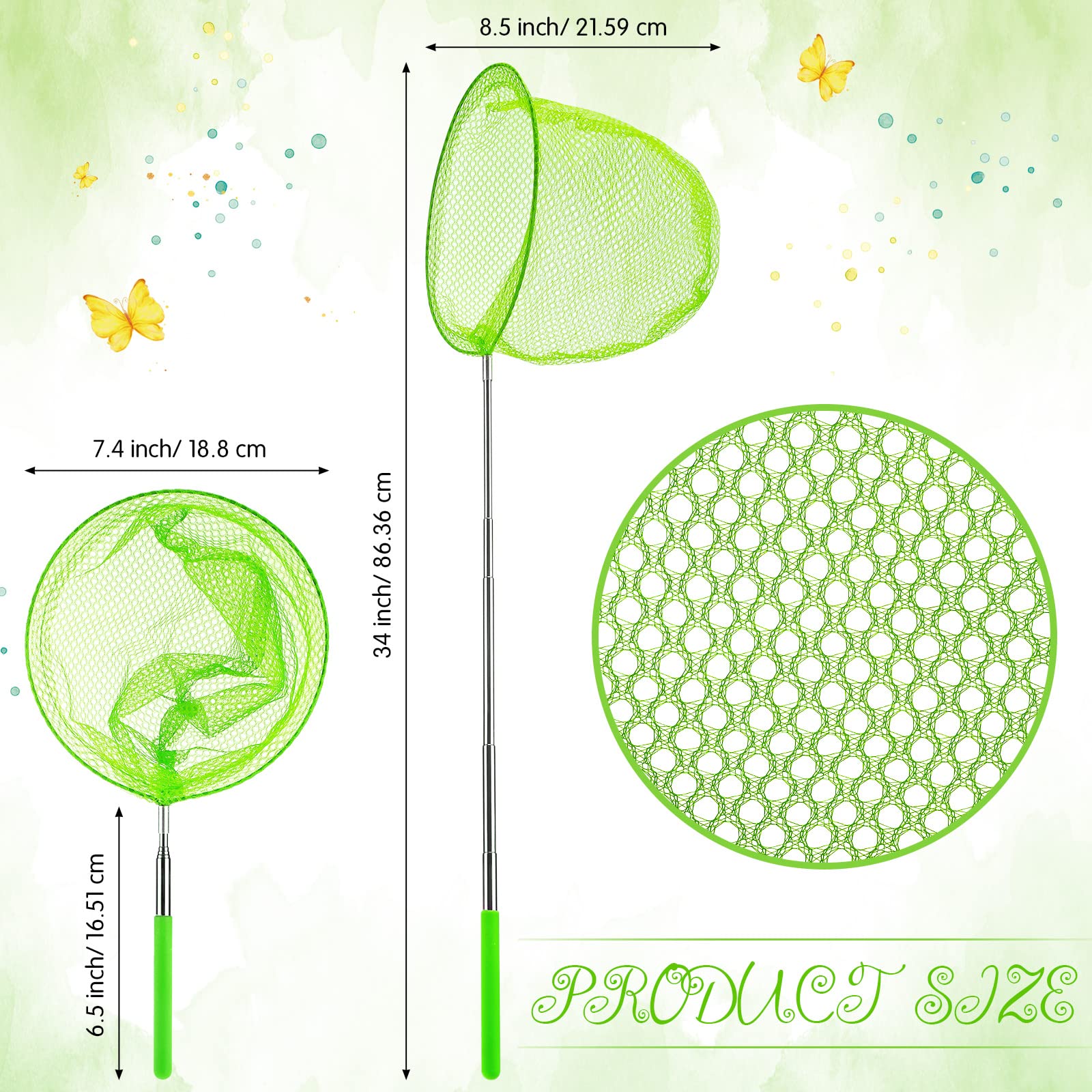 Features: The bug catching net for kids is firm and strong, which is suitable for catching butterflies, bug, fish or insects, etc. The butterfly net for kids can be applied for outdoors, hiking, camping, wilderness adventure, nature exploration and so on. Specifications: Material: net, stainless steel, rubber handle Color: green, purple, blue, pink, yellow and orange Size: extended from 15 to 34 inches, diameter 8'', depth 11'' Package includes: 24 x Kids telescopic butterfly fishing nets Notes: Manual measurement, please allow slight errors on size. The color may exist a slight difference due to different screen displays.