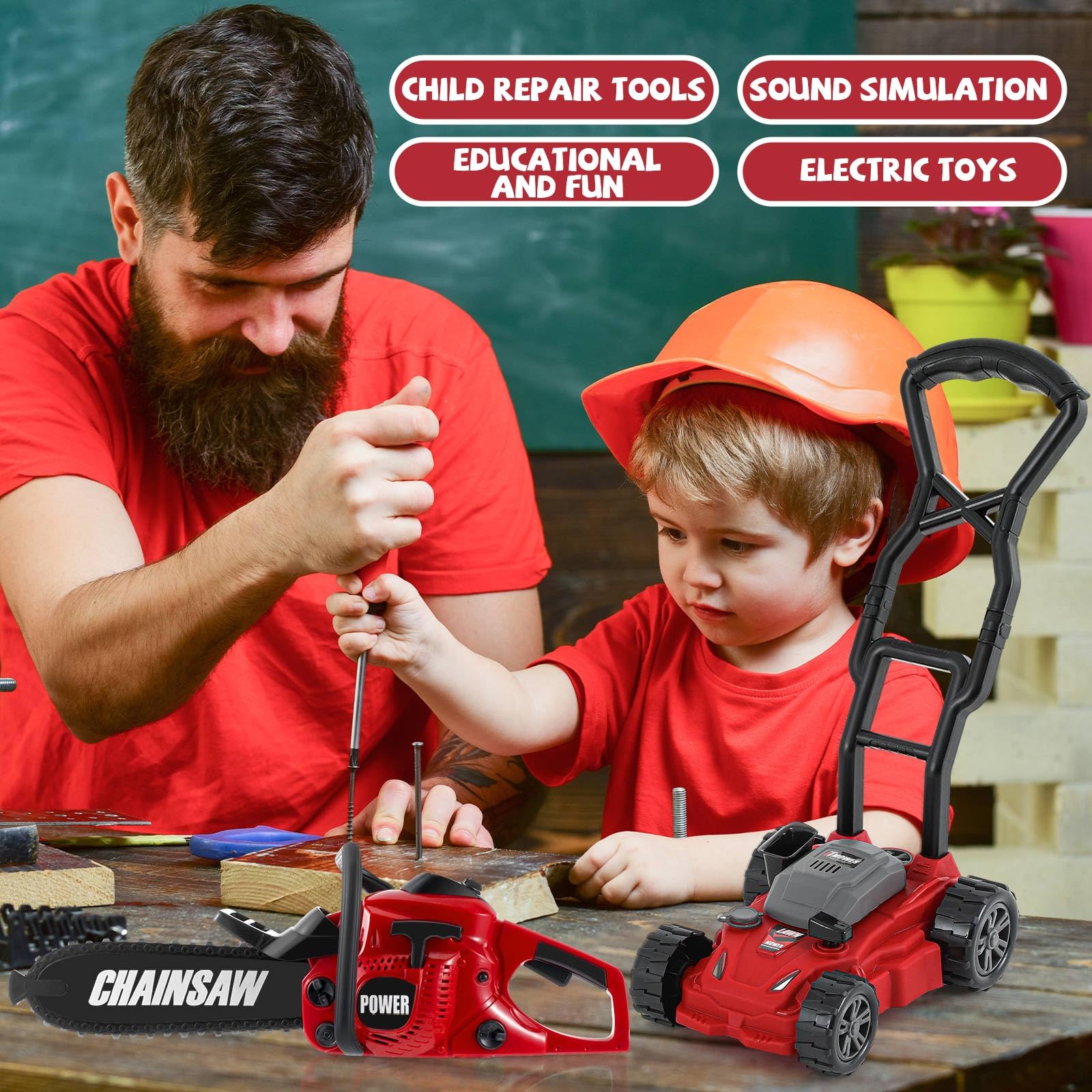 Features: The diversity of sizes and shape of yard equipment simulates genuine hardware tools allowing them to experience practical world scenarios remarkably. A set that keeps them entertained and engaged in lawn mowing. Ideal props for dress up games. Specifications: Material: ABS plastic Color: red and black Size: Toy chainsaw: about 16.54 x 5.12 x 4.92 inches/ 42 x 13 x 12.5 cm Push lawn mower: about 13 x 10.43 x 7.48 inches/ 33 x 26.5 x 19 cm Package includes: 1 x Toy chainsaw 1 x Push lawn mower Notes: Manual measurement please allow errors on size. The color may exist a difference due to different screen displays. Our toys are intended for play by people over the age of 8 and are played with mature-themed supervision to refrain danger. The battery life is related to the frequency and length of use of the product. If the frequency of use is high and one time use long the battery life will be relatively short. Just use 3 AA (not included) and press the button