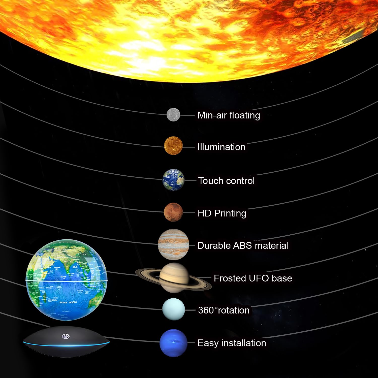 • Q: What are the lighting options available for this floating globe? A: The globe features a touch control base that allows you to switch between four lighting modes: base light only, globe light only, both lights on, and all lights off. This makes it versatile for use as a night light or decorative piece.