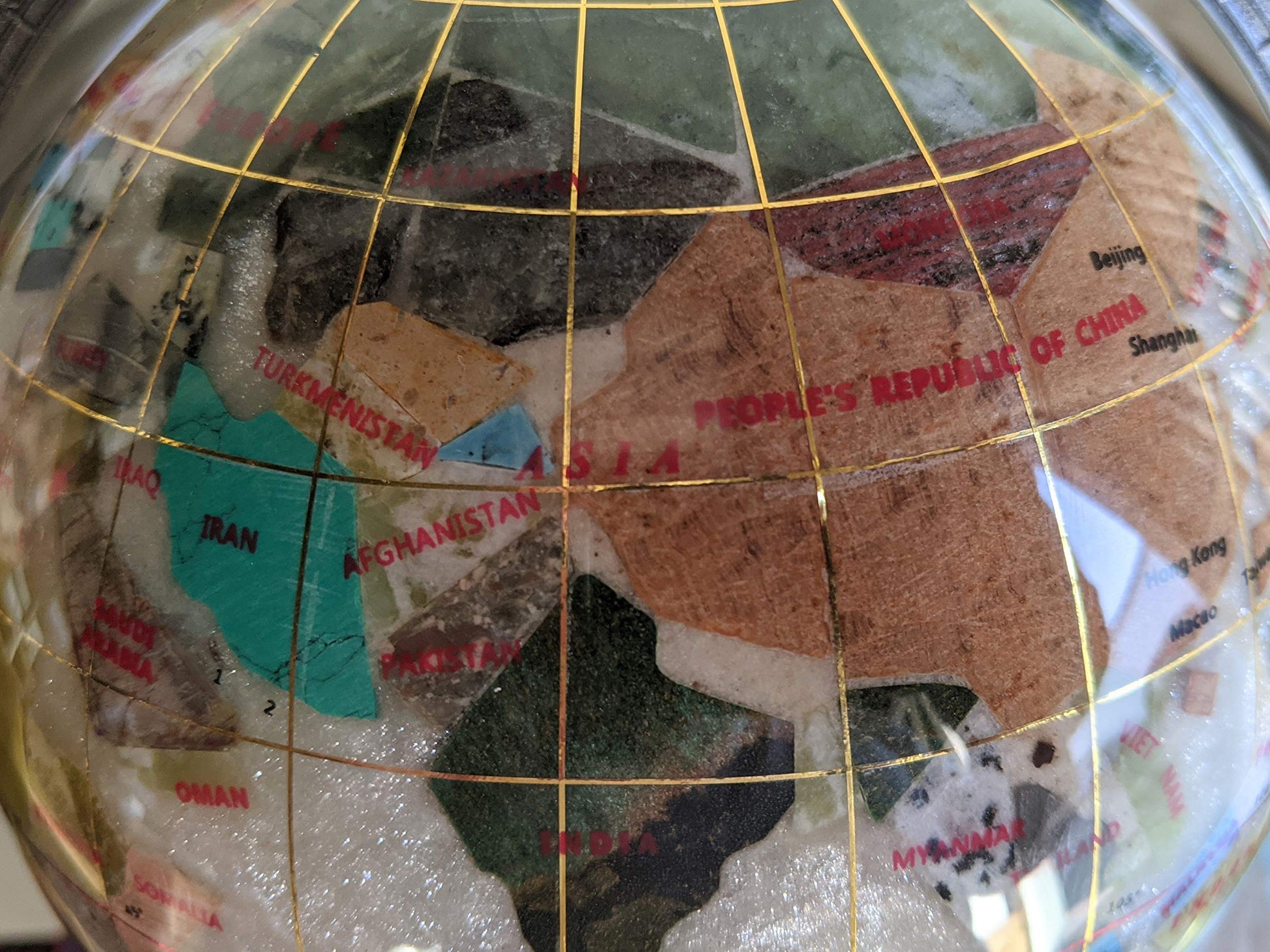 • Q: How is the globe constructed and what makes it unique? A: This globe is unique due to its intricate craftsmanship, which involves ten individual steps and over 500 hours of labor. Each country is inlaid with different stones that are carefully cut and polished for a perfect fit, making it a one-of-a-kind decorative piece.