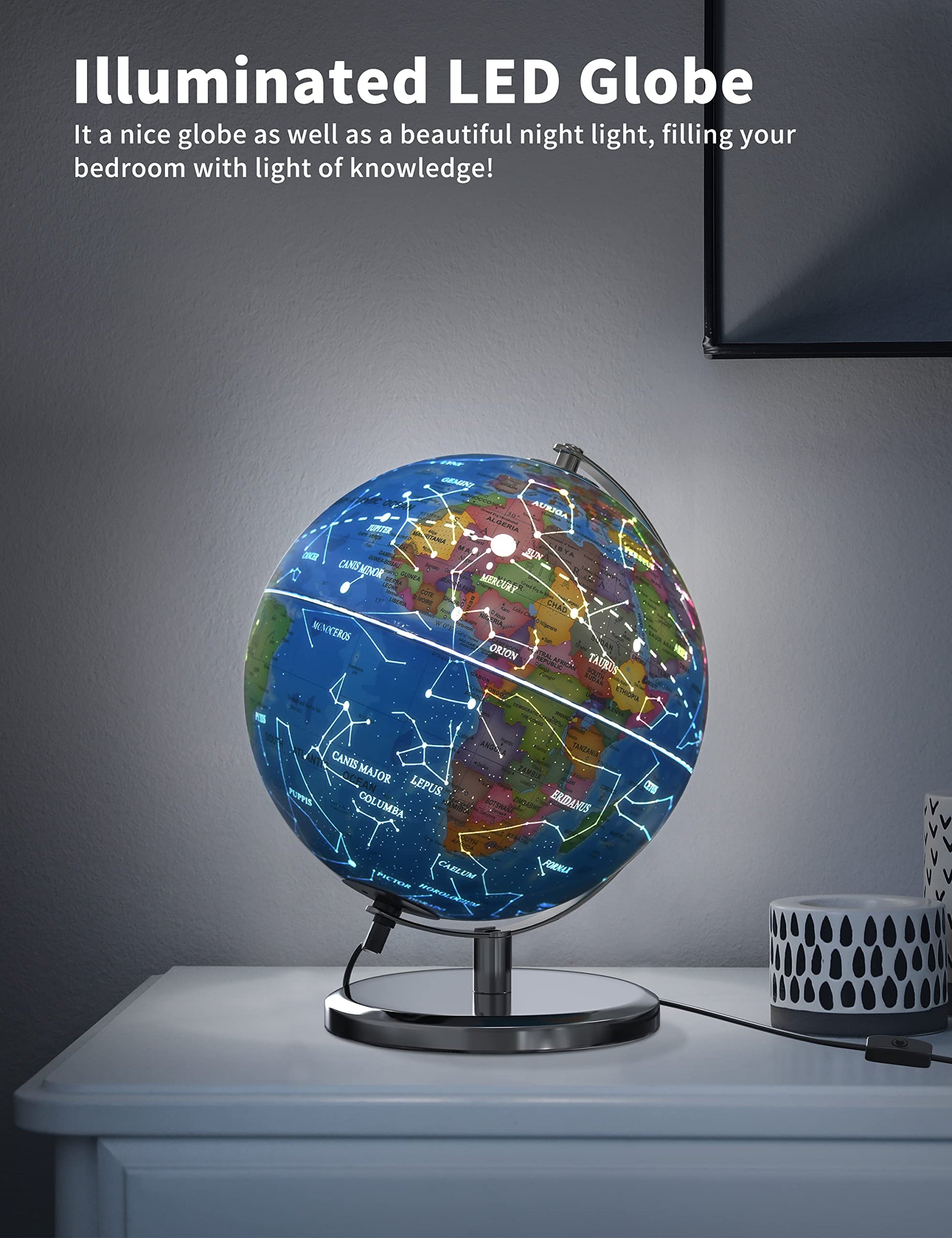 Waldauge 9'' Illuminated World Globe With Stand, Earth Globes With Stable Heavy Metal Base For Kids Classroom Learning, Led Cons