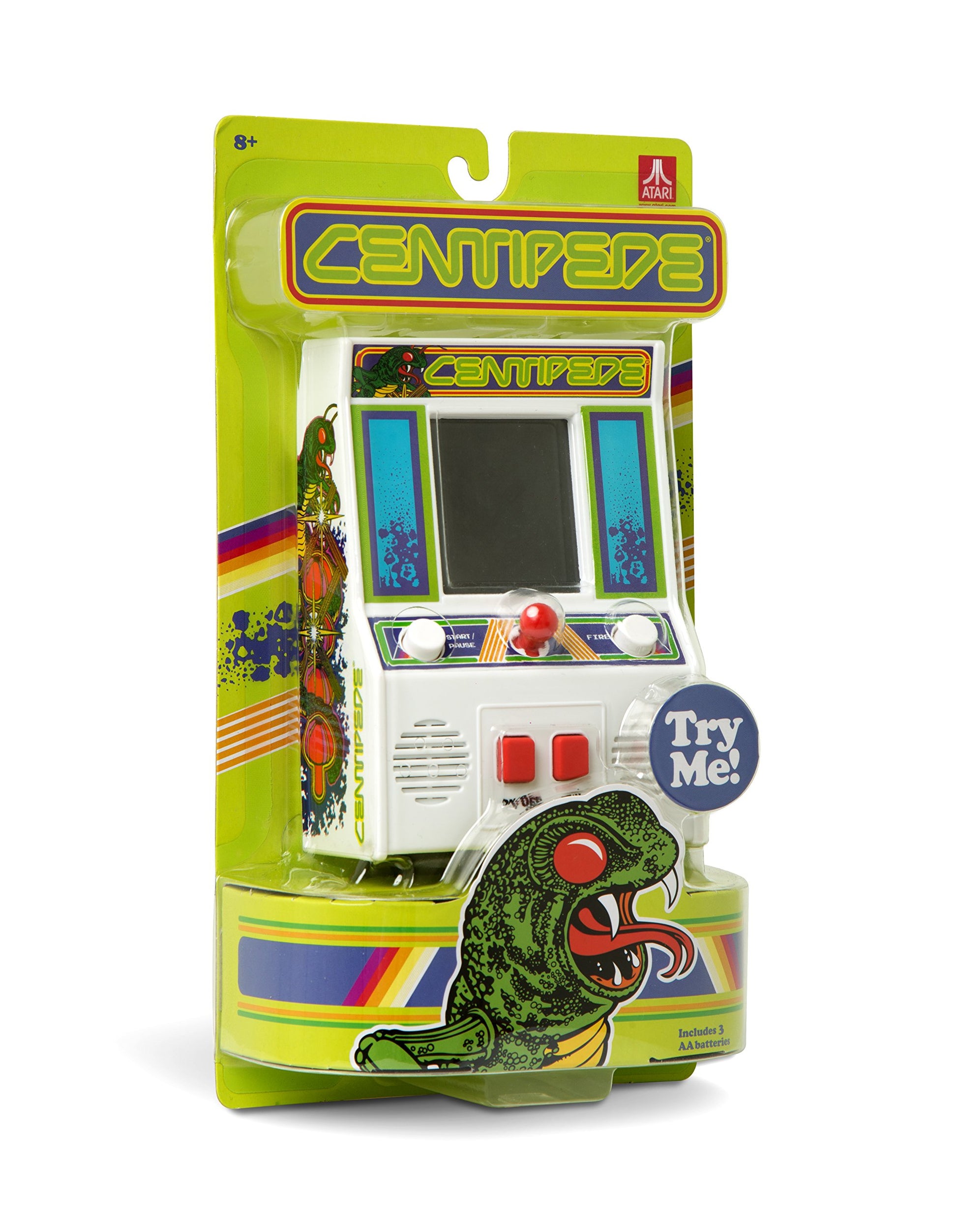 Its a blast from the past with this retro-styled Centipede mini arcade game! It looks, sounds and plays just like you remember. Move your space ship with the joy stick and hit the fire button to shoot down the Centipede before it crashes into you! Watch out for spiders and scorpions too. Includes 3 AA batteries.
