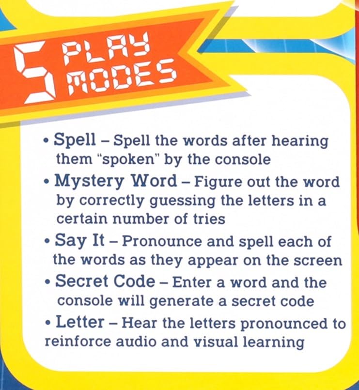 - Q: What are the different play modes available in Speak & Spell? A: The Speak & Spell offers 5 engaging play modes: Spell, Mystery, Say It, Secret Code, and Letter, providing varied educational experiences to keep children entertained while they learn.