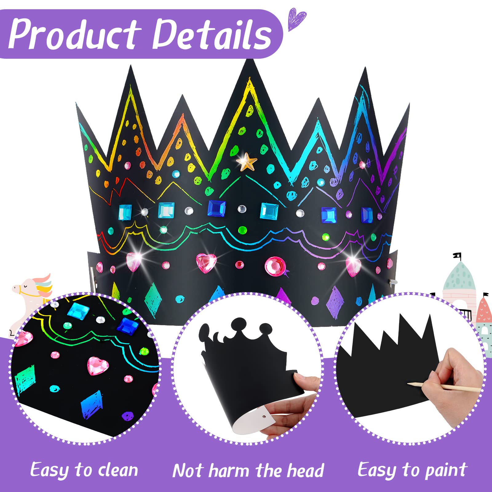 110 Pcs Paper Crafts Crowns Bulk Set Scratch DIY Paper Crowns with Rainbow Crown Headband Hats Wooden Styluses Craft Elastic Ban
