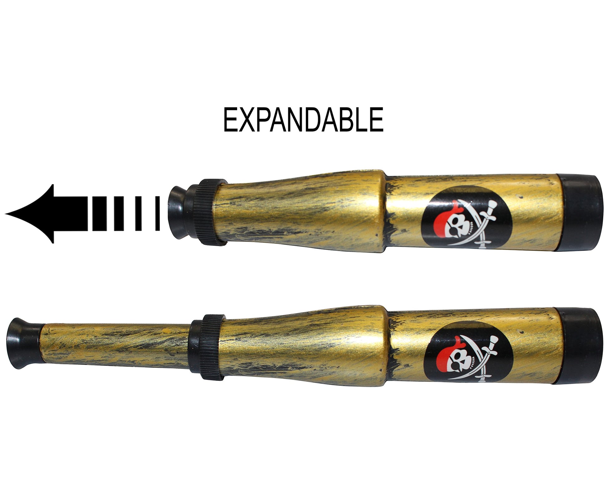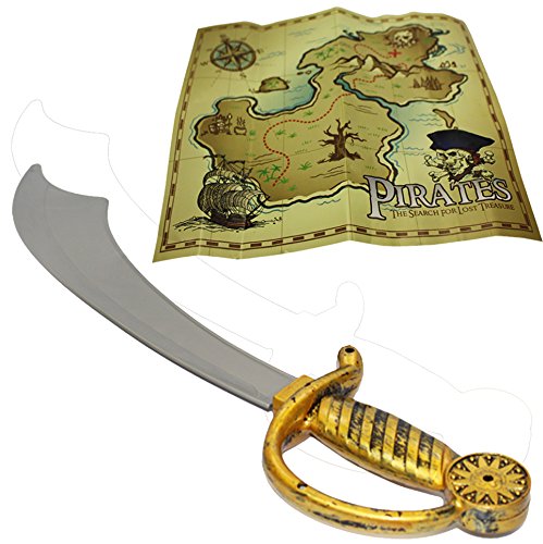 Cross the Seven Seas with this fun costume set. This awesome children's pirate costume of 9 items includes a Skull and Crossbones black fabric pirate hat and vest an 18 child safe plastic pirate decorative replica blade a gold medallion a silver earring a black plastic eye patch an antique look compass a treasure map and a 7.5 collapsible telescope.