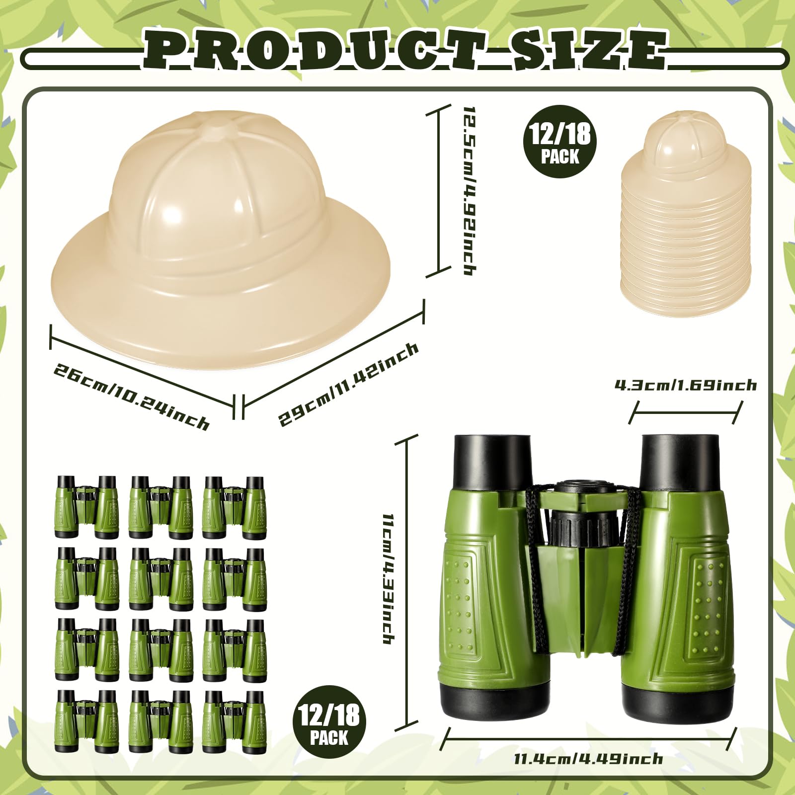Features: Role play entertainment: These explorer binoculars offer countless hours of fun with little ones pretending to be jungle explorers or bird watchers stimulating creative thinking hand eye coordination and more. Enhance closeness with nature: These jungle costume accessories featuring binoculars and hats offer a memorable and joyous experience. The binocular toy helps little ones learn about nature's beauty fostering a love for the environment while having fun at the same time. They are ideal educational tools that blend learning and entertainment Specifications: Main material: plastic Main color: green beige Size: Binocular: approx. 4.49 x 4.33 x 1.69 inches/ 11.4 x 11 x 4.3 cm Hat: approx. 11.42 x 10.24 x 4.92 inches/ 29 x 26 x 12.5 cm Package includes: 12 x Compact binoculars for kids 12 x Beige party hats Notes: Manual measurement please allow slight errors on size. The color may exist a slight difference due to different screen displays. Winding risk may exist mature-themed supervision is needed when it is played by your kids. Suitable for people over 12 years old.
