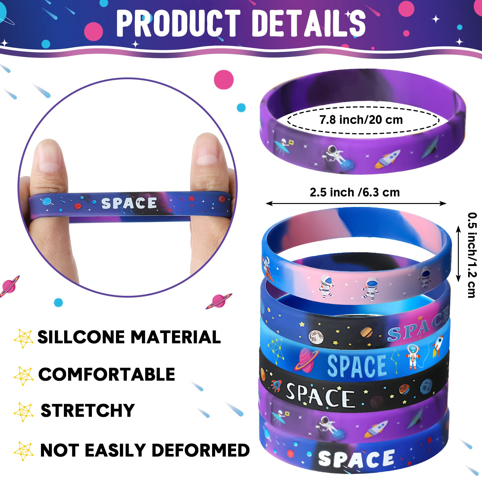 - Q: How many space-themed designs do the bracelets come in? A: The pack includes 48 silicone wristbands featuring 6 different space-themed designs, with 8 pieces of each style, providing a variety of options for kids.