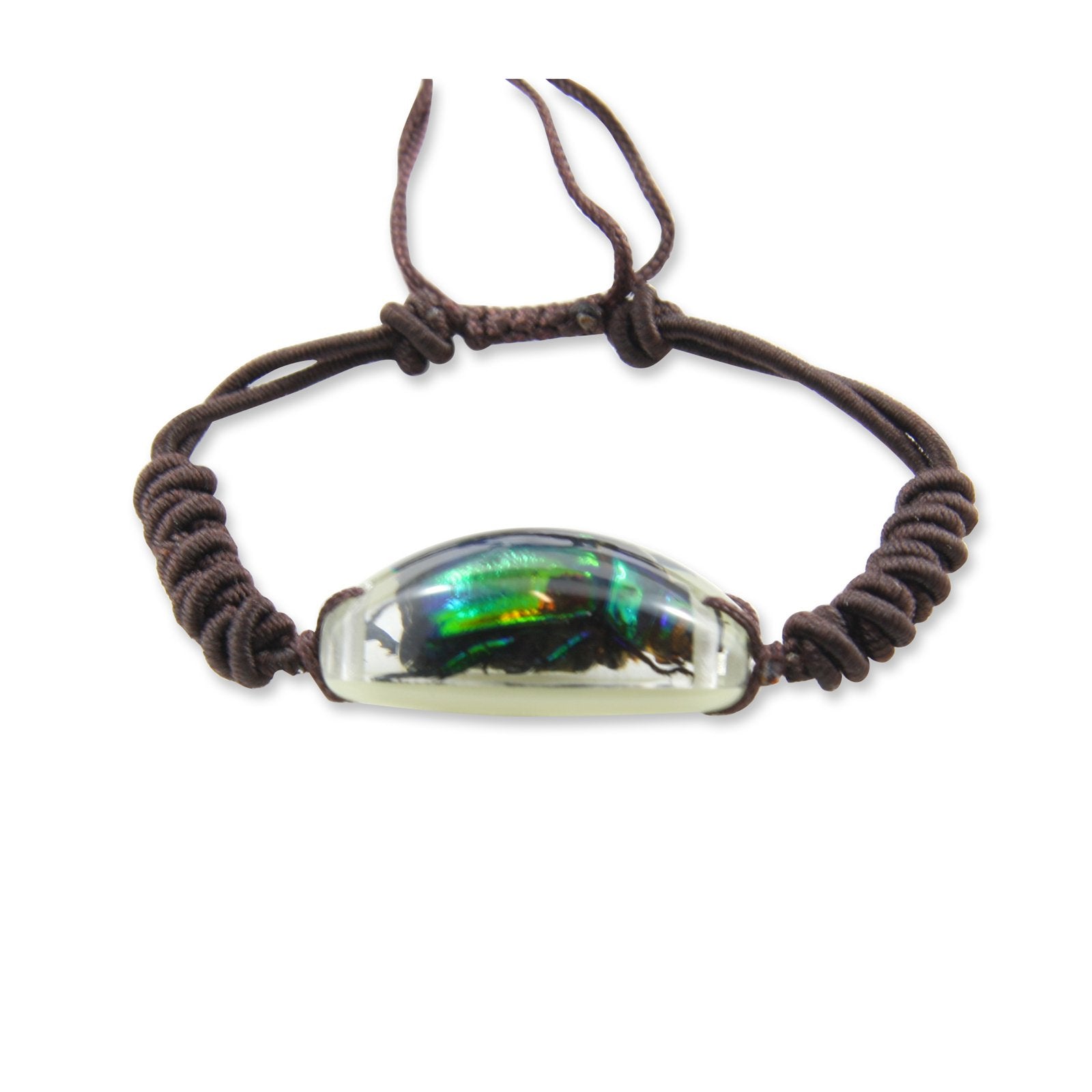 Product DescriptionThis bracelet has a Real Green Chafer Beetle encased in an oval acrylic with a glow in the dark background with adjustable cord.The length of adjustable cord is 6 1/2 to 10 in. It is easy to adjust by pulling the cord where it joins and adjust to the desired size.The acrylic size is 1 1/4 x 7/8 x 1/2 in.From the ManufacturerThis bracelet has a REAL green chafer beetle encased in a rectangle shaped acrylic with a glow in the dark background. It is easy to adjust by pulling the cord where it joins and adjust to the desired size. Each specimen is unique and different and may differ from the picture shown.