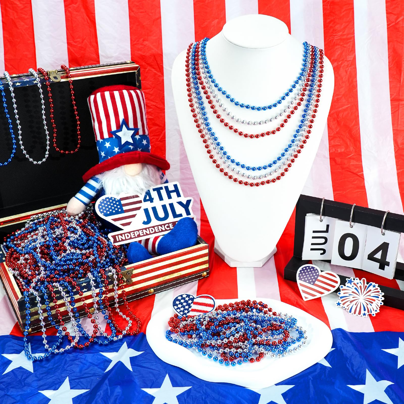 SHAOQINLIN 102 PCS Patriotic Bead Necklaces, 4th of July Beads Necklaces Bulk 4th of July Accessories 33 Inch Metallic Red/Silve