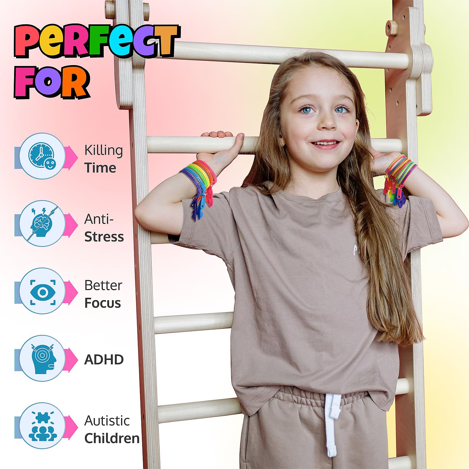 - Q: What are the benefits of using UpBrands Pop-It Zipper Bracelets for kids? A: UpBrands Pop-It Zipper Bracelets are designed to help children focus, unwind, and engage their senses. They serve as an effective sensory solution for kids with ADHD or autism, promoting stress relief and fine motor skill development through interactive play.
