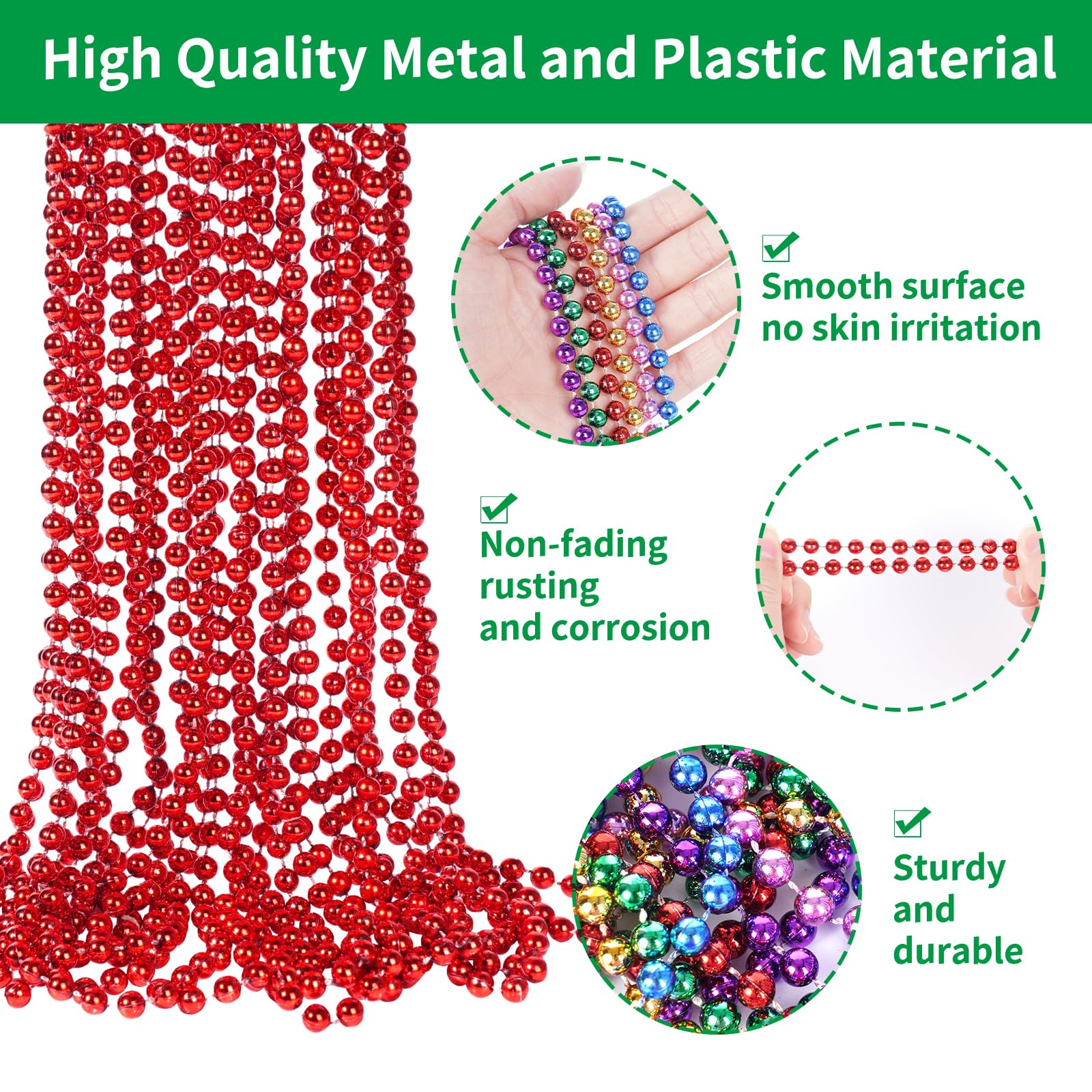 Mardi Gras Beads: 15 pcs of bead necklaces bulk, red bead necklace, comes in classic Mardi Gras colors. The red Mardi Gras beads necklace make perfect accessories for Mardi Gras costumes and Parades | Premium Quality: Mardi Gras beads necklaces are made of sturdy and durable plastic material, do not break easily, non-fading, rusting and corrosion, round metallic beads have a smooth surface and are non-irritating to the skin, providing you with a comfortable wearing experience while you can use it for a long time | 33'' 7 mm Metallic Beaded Necklace: Each Mardi Gras necklace is 33 inches long and has 7 mm beads. The party beads size make they are suitable for everyone, they can wear them as carnival decorations for dress-up party | Perfect Party Favors: These beaded necklaces are perfect for Mardi Gras decorations and Mardi Gras parades, party beads necklaces are also widely used for Christmas party, St. Patrick's Day celebrations, Halloween party, birthday party, New Year's Eve party, nightclub dress-up events, wedding favors and parades, etc | Ideal for Any occasion: The red bead necklace can be used not only as necklaces, but also used for table and vases ornaments at home to add party atmosphere, suitable for hanging around the street, stores, classrooms and other places. They are delicate costume necklace accessories and ideal party favors